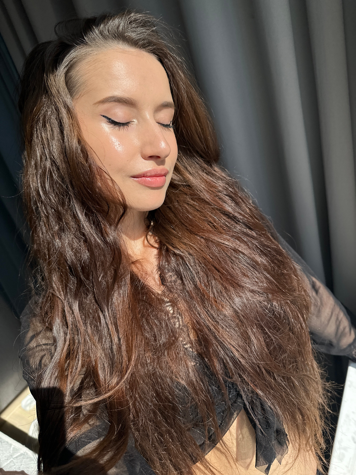 A close-up, vertically oriented photograph captures a woman lying down, with her head positioned towards the left side of the frame and her body extending to the right. Her eyes are closed, conveying…read more
