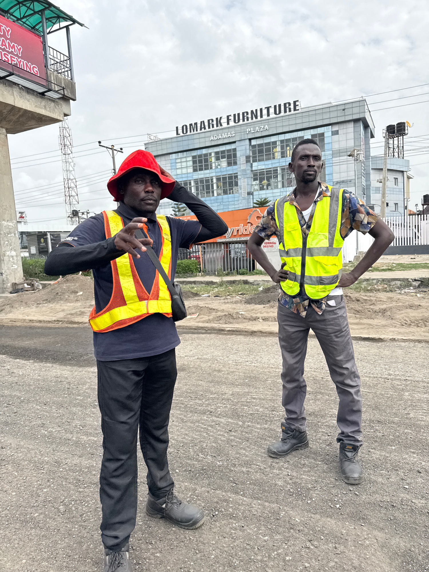 Two men are standing on a paved surface, likely a road or sidewalk, in Lekki, Nigeria. One man, positioned higher in the frame, is wearing a yellow safety vest over a patterned shirt, gray pants, andβ¦read more