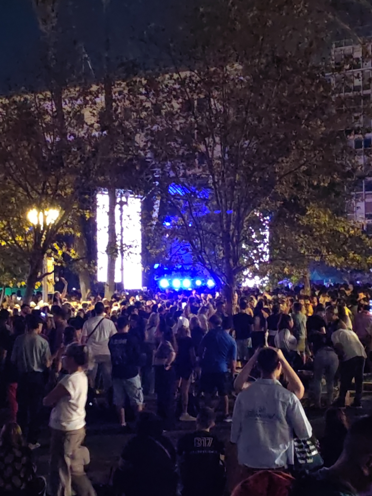 A nighttime scene shows a large crowd gathered outdoors, likely in Buenos Aires, Argentina, due to the architecture visible in the background. The crowd appears to be attending a concert or event, sug…read more