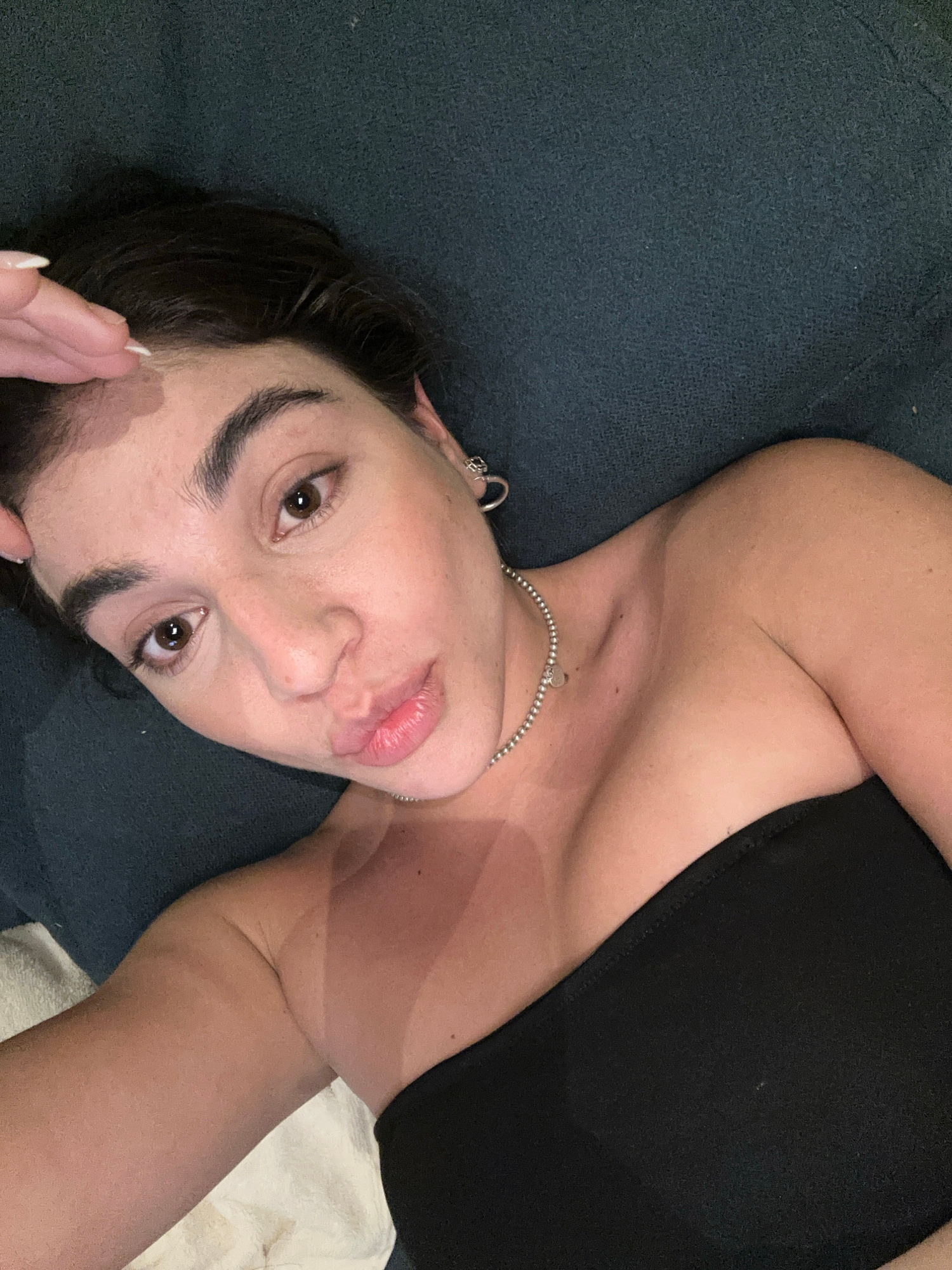 A woman is lying on a dark blue or green textured surface, possibly a cushion or blanket. She is wearing a black strapless top and a silver beaded necklace. Her hair is dark, and her nails are paintedβ¦read more