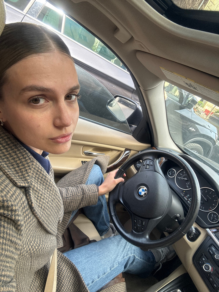 An adult female is depicted seated in the driver's position of a BMW vehicle with a beige interior. She has brown hair pulled back, brown eyes, and maintains direct eye contact with the camera. Her at…read more