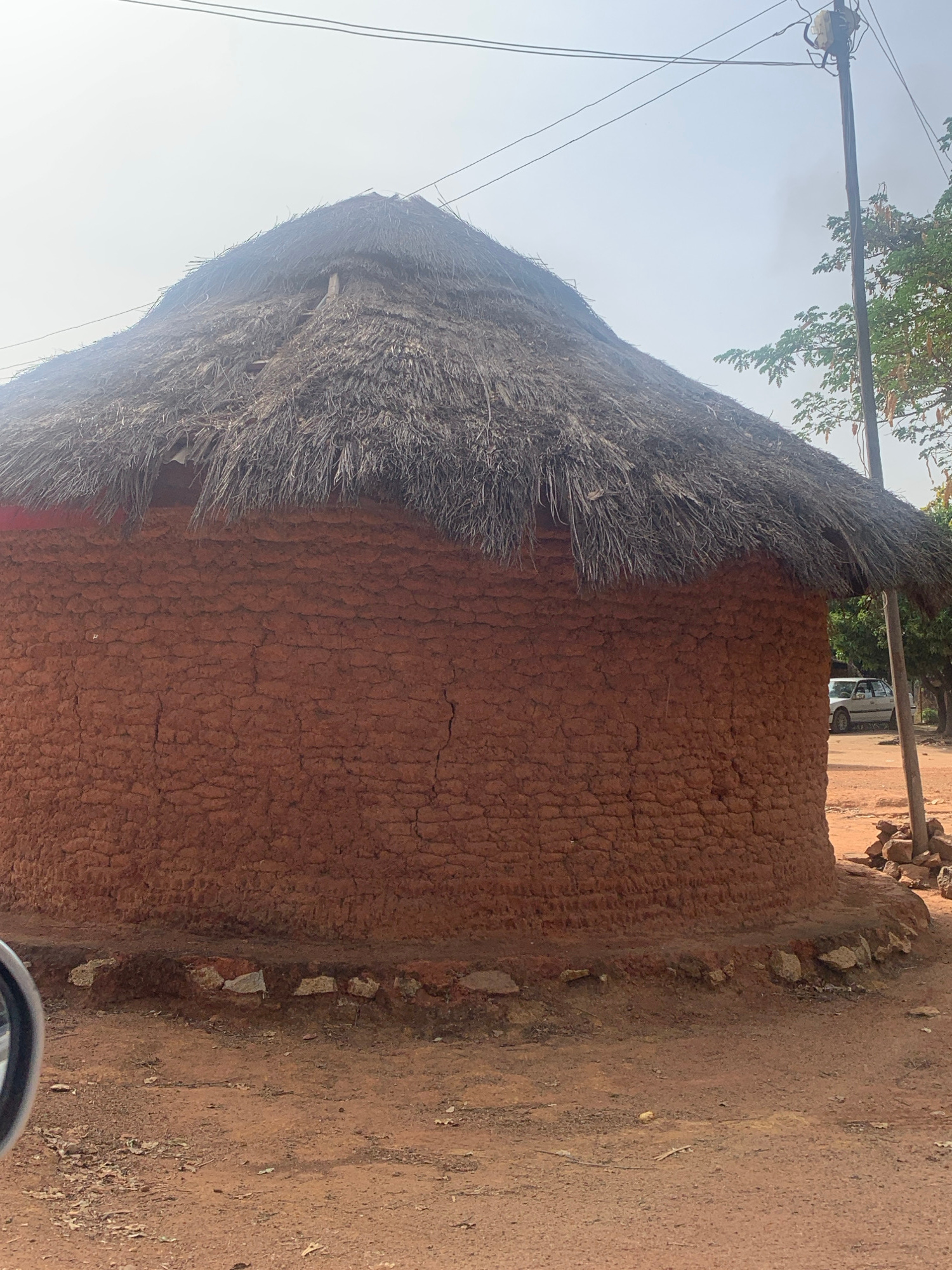 The image shows a mud brick building with a thatched roof. The building is located next to a dirt road. There are trees and telephone poles visible in the background. Based on the provided information…read more