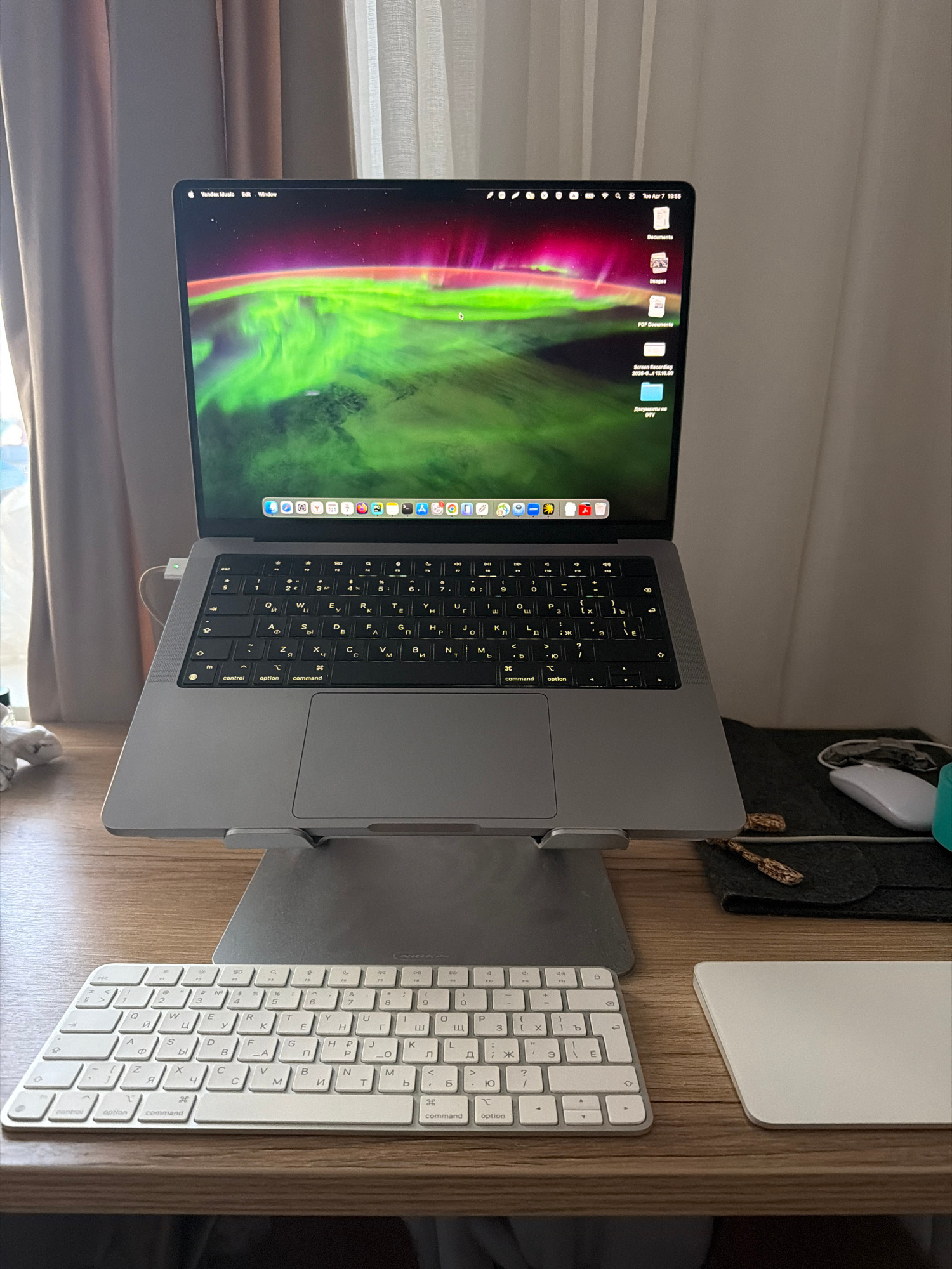 The image shows a desk setup with a MacBook Pro in a silver stand, a white Apple Magic Keyboard with Russian characters, a white Apple Magic Trackpad, and a turquoise mouse, all on a light brown woode…read more