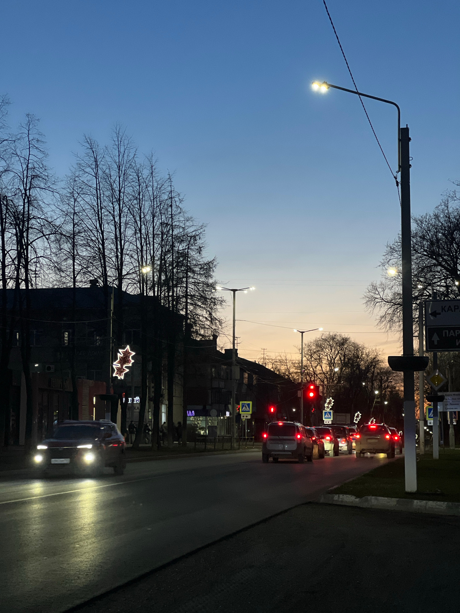 The image depicts a street scene in Chaikovsky, Russia, at twilight. The sky transitions from blue to orange. Traffic is stopped at a red light, with several cars visible, including a car with illumin…read more