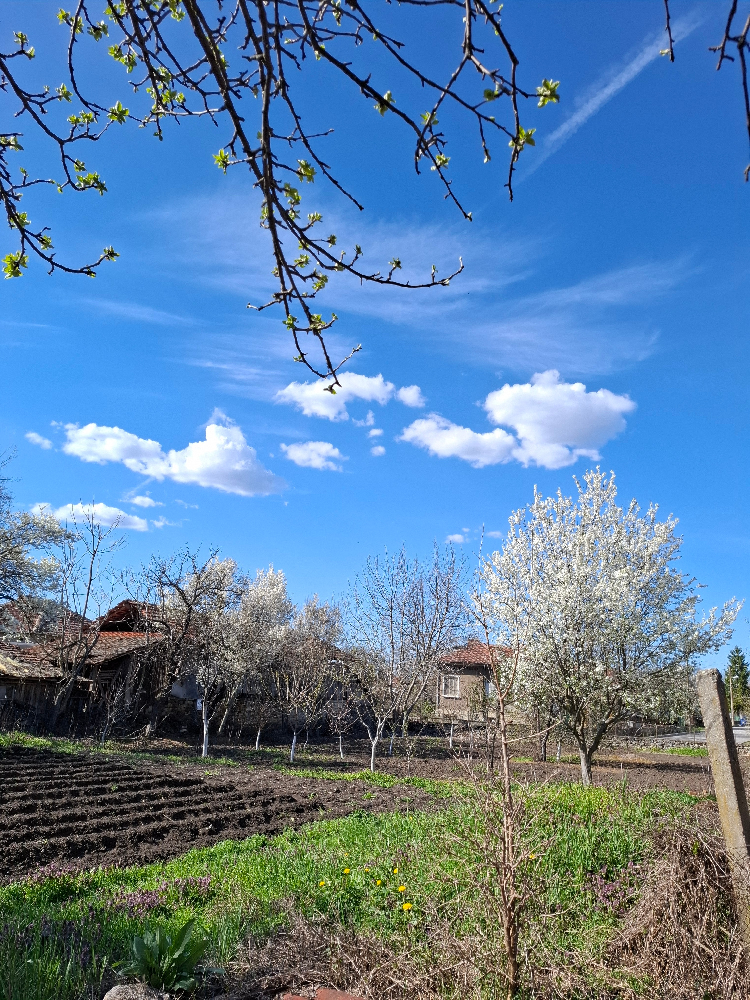 The image shows an outdoor scene in Gramada, Bulgaria. The foreground features a view of plowed soil. Green grass and vegetation are present along the edges of the plot. Trees, some in full bloom with…read more