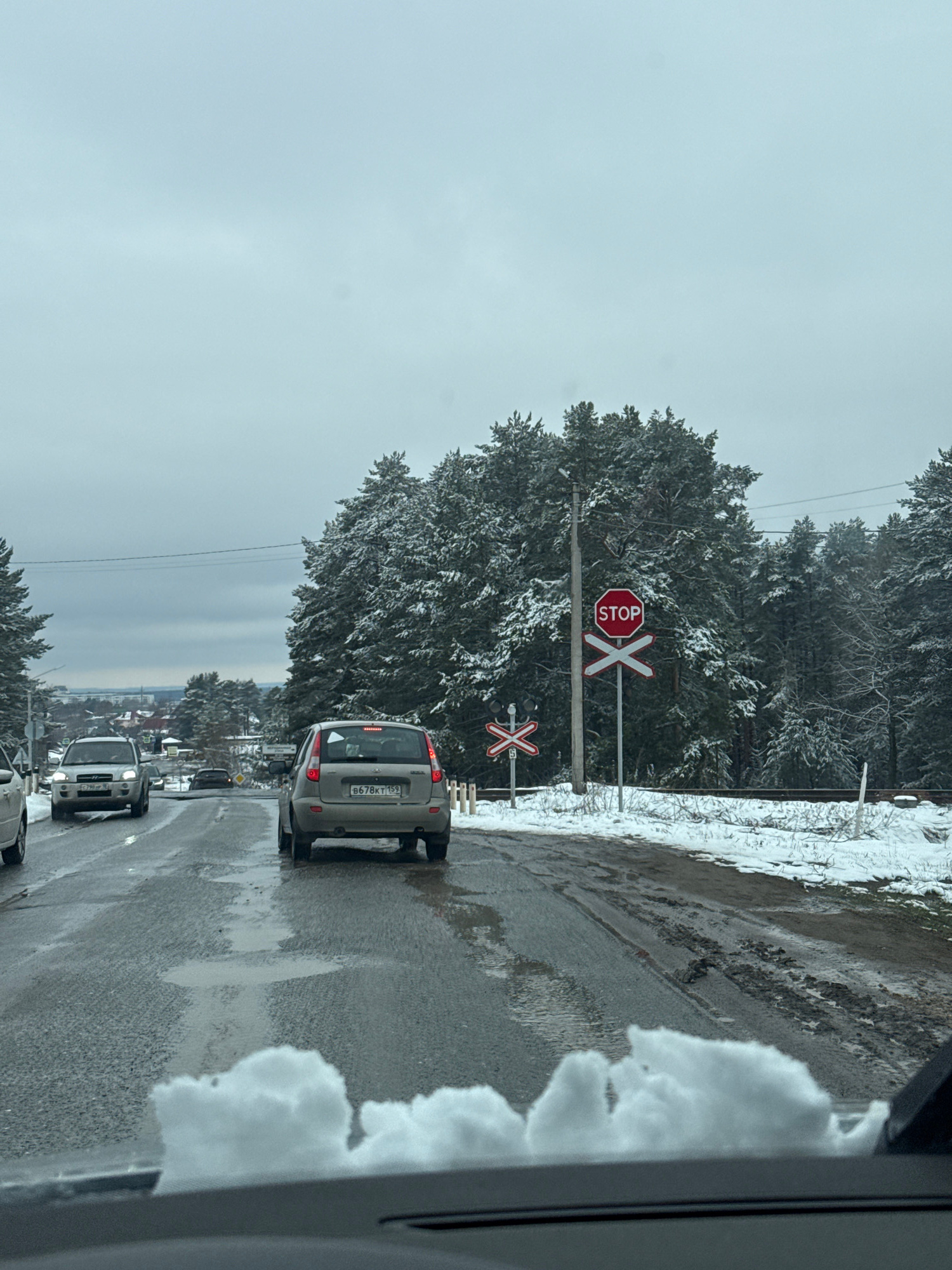 The image shows a road in what appears to be a snowy, mountainous area, possibly near or in a town, given the buildings visible in the distance. Cars are lined up on the road, with a light-colored SUV…read more
