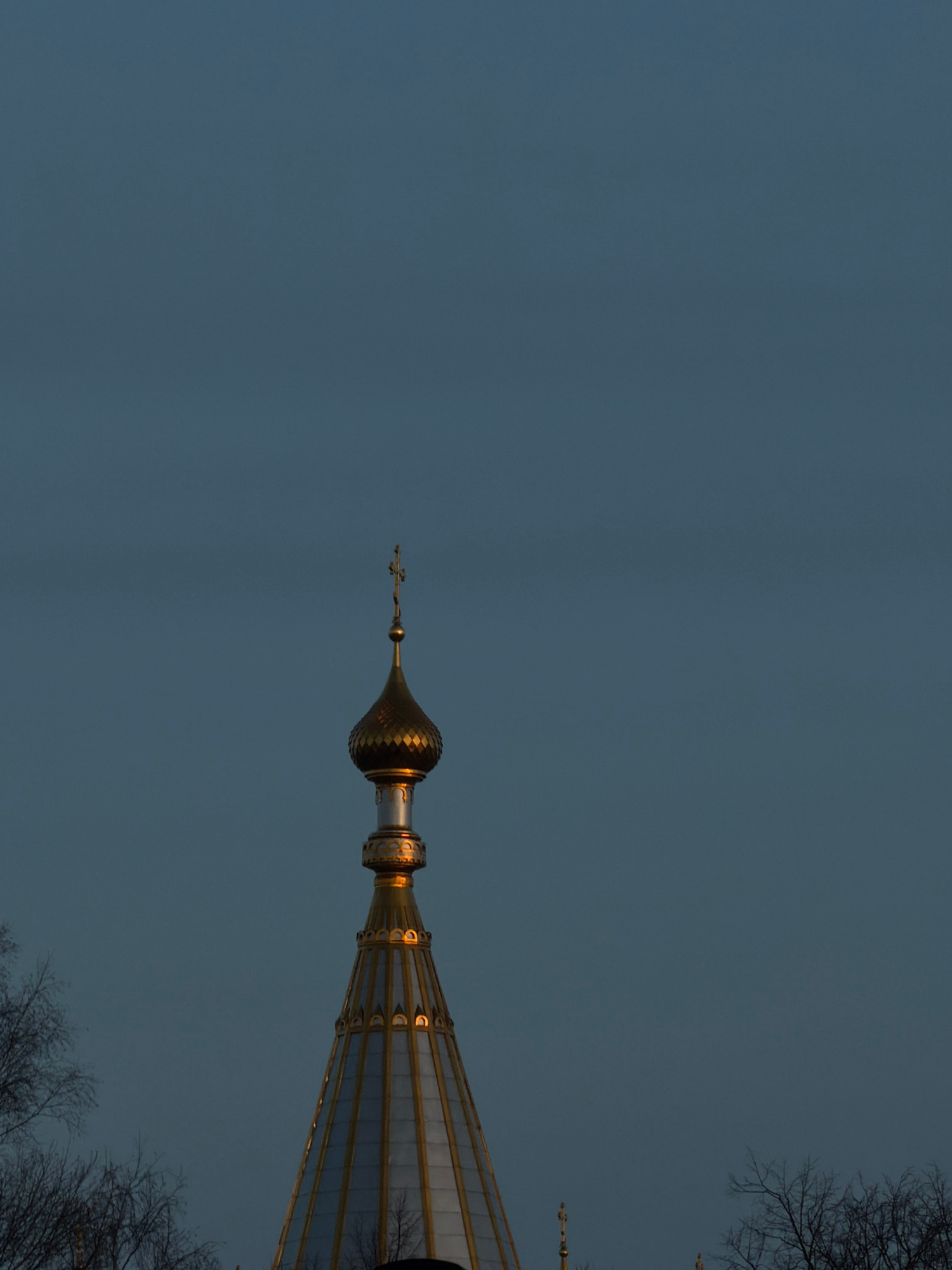 The image shows a nighttime view of the Alexander Nevsky Cathedral in Izhevsk, Russia. The golden dome and cross of the cathedral are prominently featured against a dark blue sky. Bare branches of tre…read more