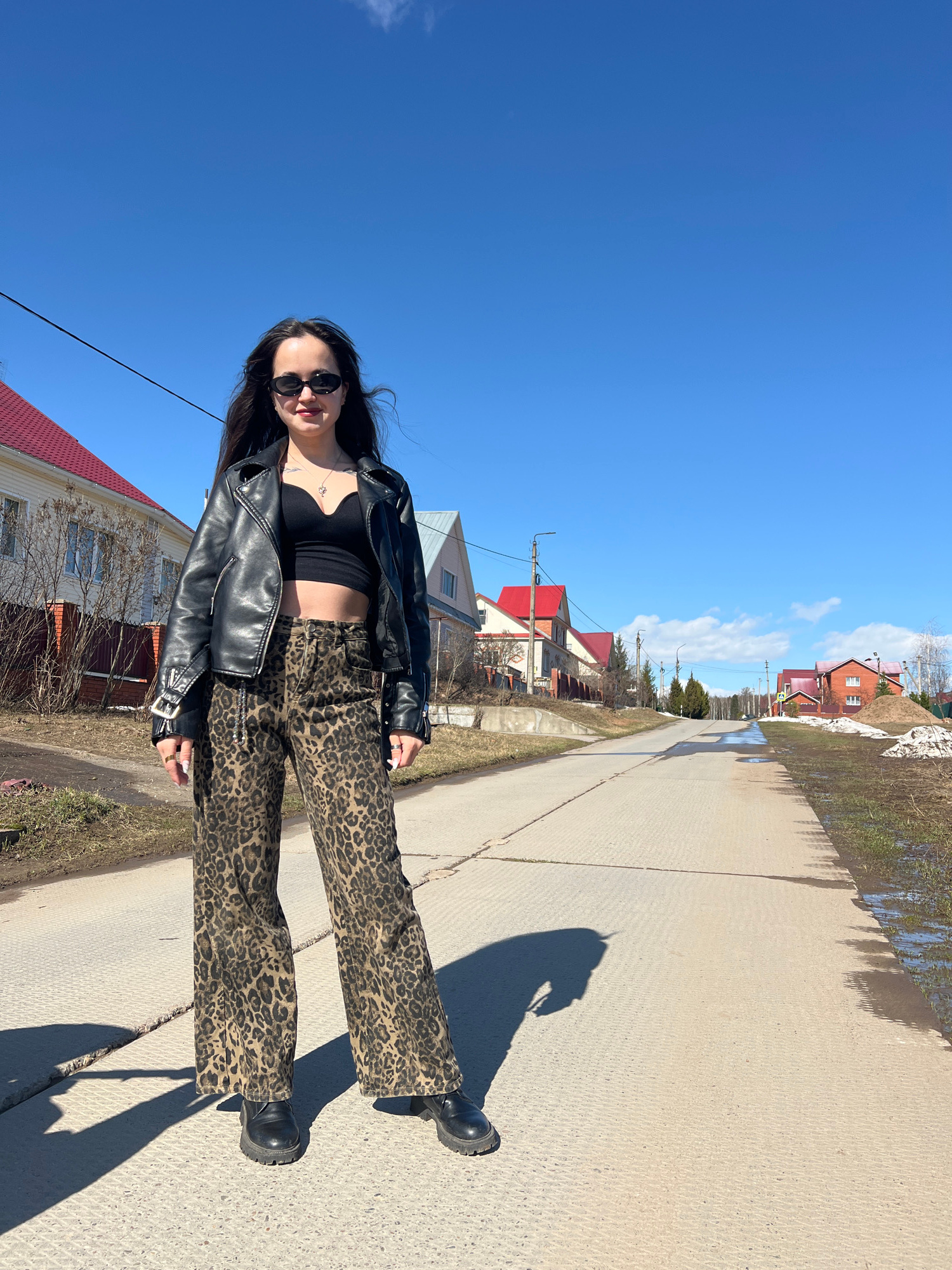 A young woman stands on a paved walkway in Noviy, Russia. She is dressed in a black leather jacket, a gray top, and animal-print pants, along with black shoes and sunglasses. The sky is clear and blue…read more