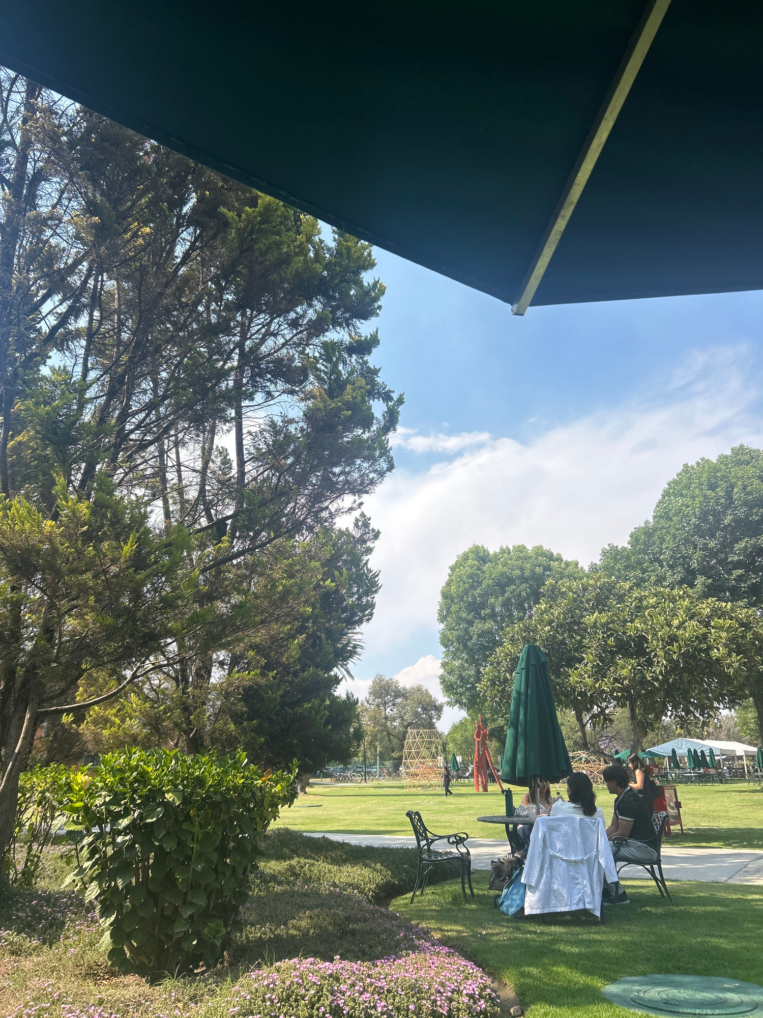 The image depicts an outdoor scene in San Bernardino Tlaxcalancingo, Mexico. The camera is positioned under an awning. The scene includes a manicured lawn with trees, shrubs, and flowers. In the dista…read more