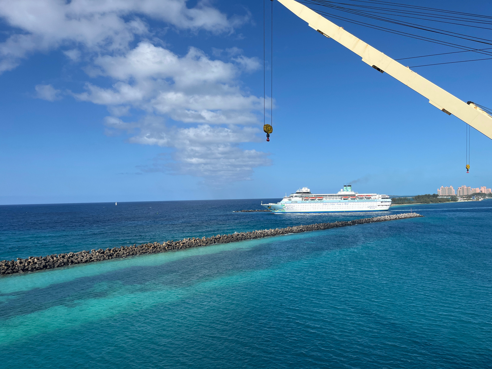 The image shows a wide expanse of turquoise ocean under a partly cloudy blue sky. In the middle distance, a large white cruise ship is sailing past a long, dark-colored rock breakwater. The breakwater…read more