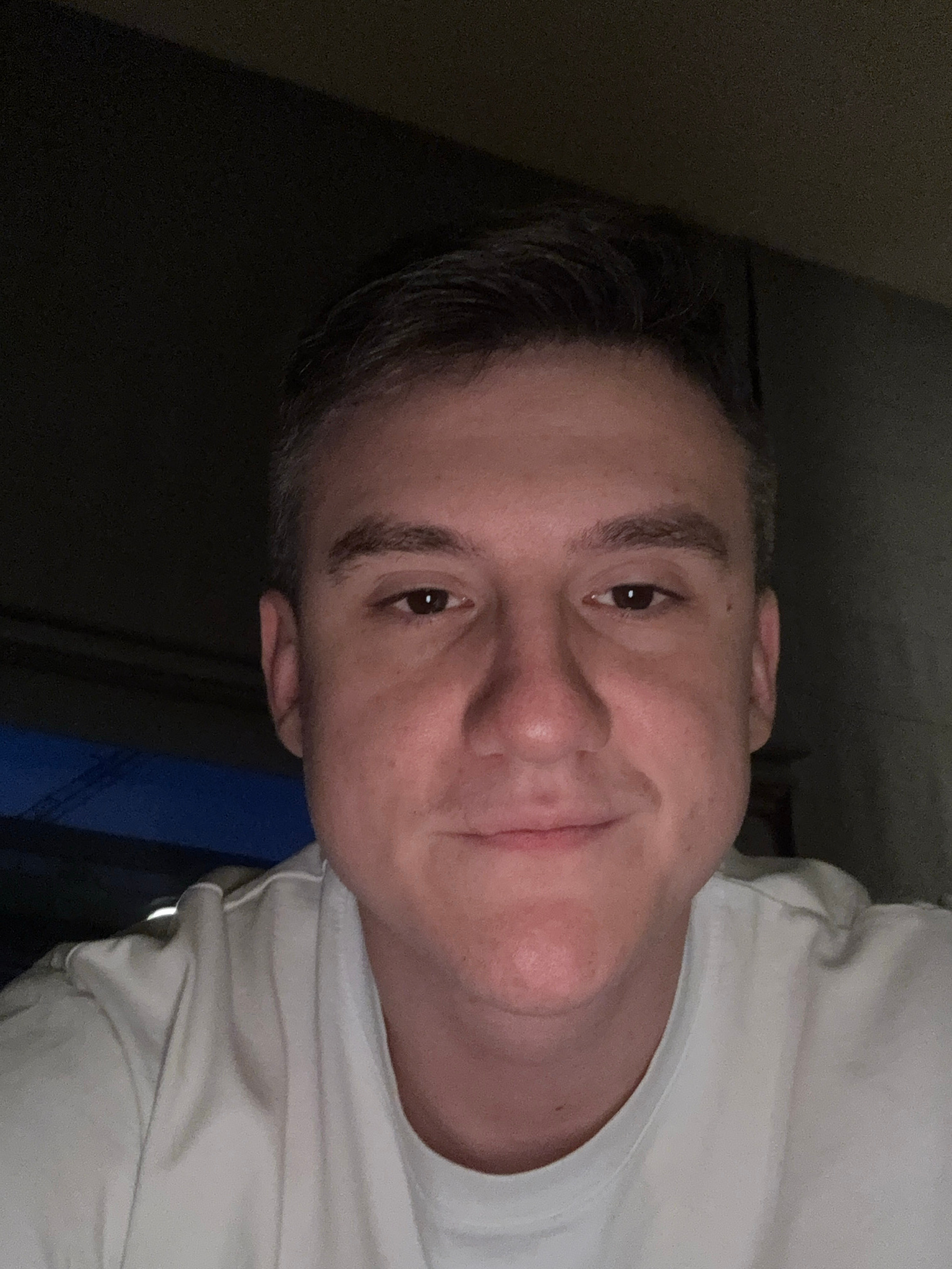 A close-up, slightly tilted shot features a fair-skinned man with short, dark hair. He is wearing a light-colored t-shirt. The background is dark and indistinct, suggesting a poorly lit indoor setting…read more