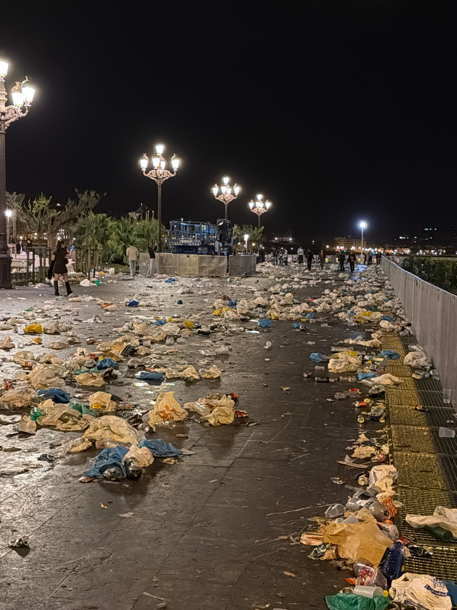 The image depicts a street in San Sebastián, Spain, heavily littered with trash after an event. The street is paved and lined with ornate lampposts. The trash is mostly comprised of plastic bags and b…read more