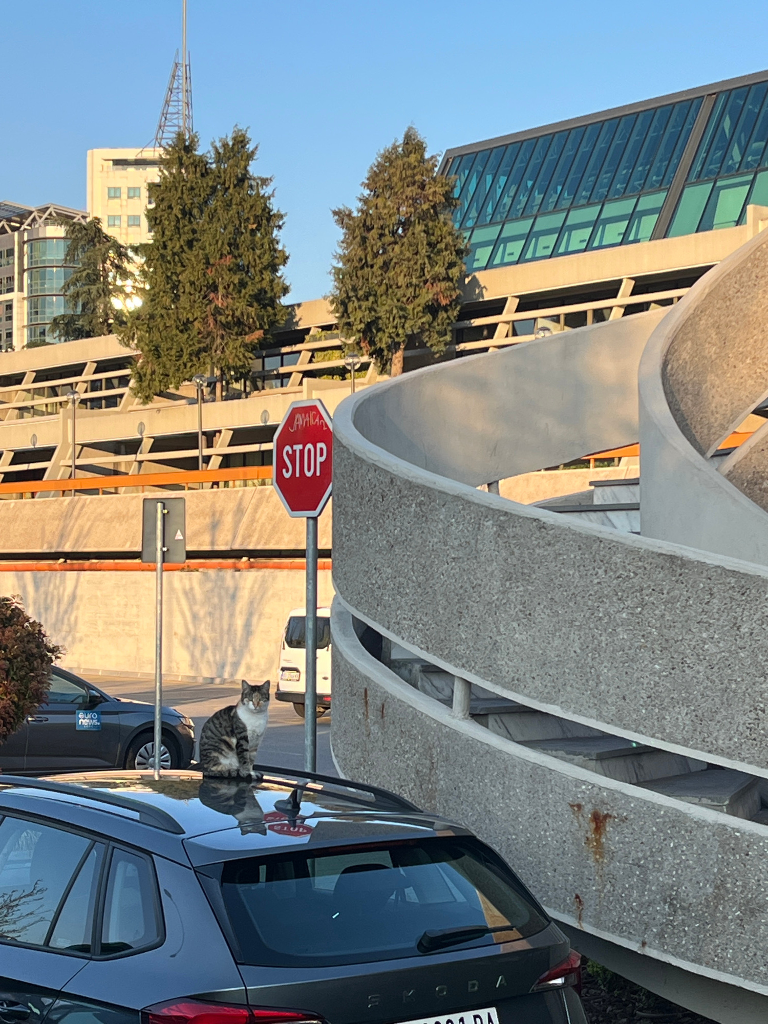 A sideways outdoor shot depicts a grey and white tabby cat perched on the roof of a dark blue car. Behind the car is a grey pedestrian walkway and a stop sign. Adjacent to the stop sign is a multi-sto…read more