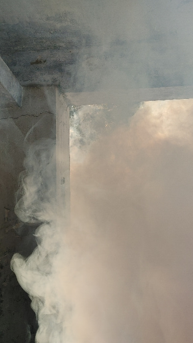 The image displays the interior of a concrete structure, presumably located in Dhaka, Bangladesh, heavily permeated by dense smoke. The left side of the frame features a grey concrete wall exhibiting…read more