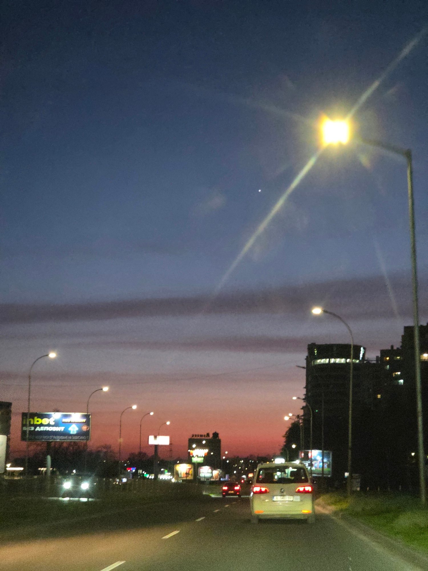 The image shows a nighttime scene along a road in Varna, Bulgaria. The sky transitions from dark blue to shades of pink and orange near the horizon. A tall street lamp is visible on the left side, emi…read more