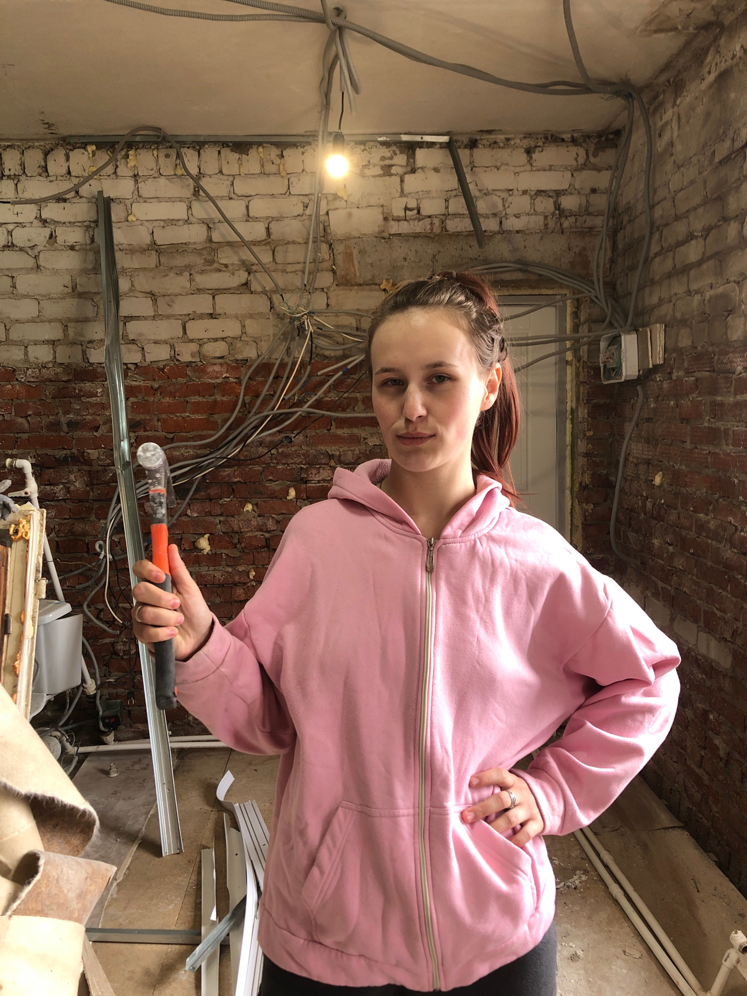 A young woman stands in a room with exposed brick walls and a ceiling with exposed wiring, possibly under renovation. She is wearing a pink zip-up hoodie and holds a tool with an orange handle and a m…read more
