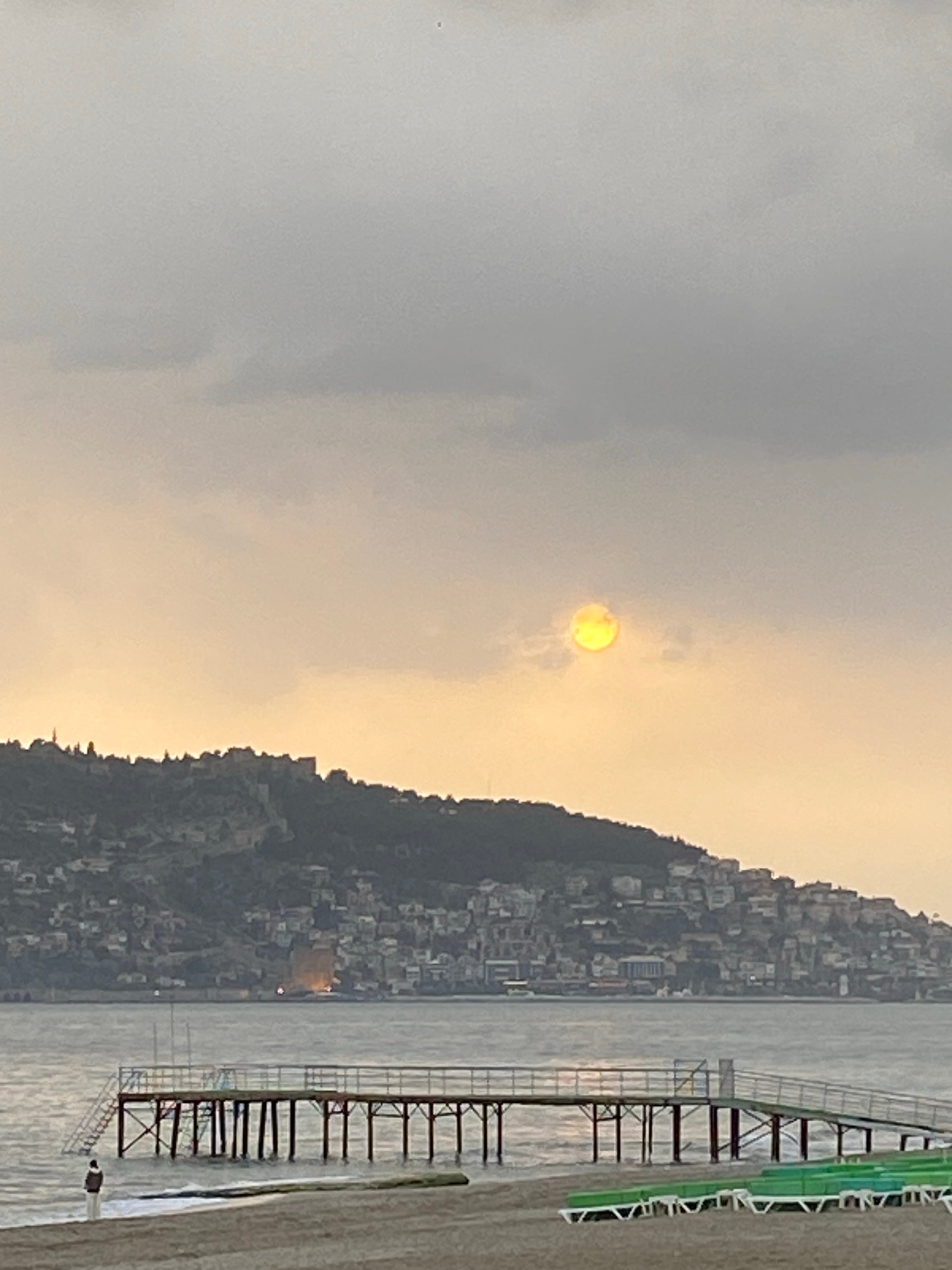 The image depicts a coastline at dusk. A pale, yellowish sun shines through a hazy sky. A large hill densely populated with buildings rises from the water's edge. A pier or structure extends into the…read more