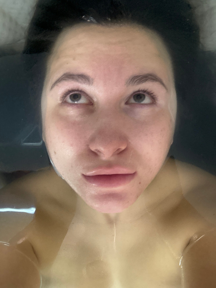 A woman is partially submerged in water. She has light skin with freckles, defined eyebrows, and long eyelashes. Her lips are full, and her eyes are open. The water appears dark around her hair and cl…read more