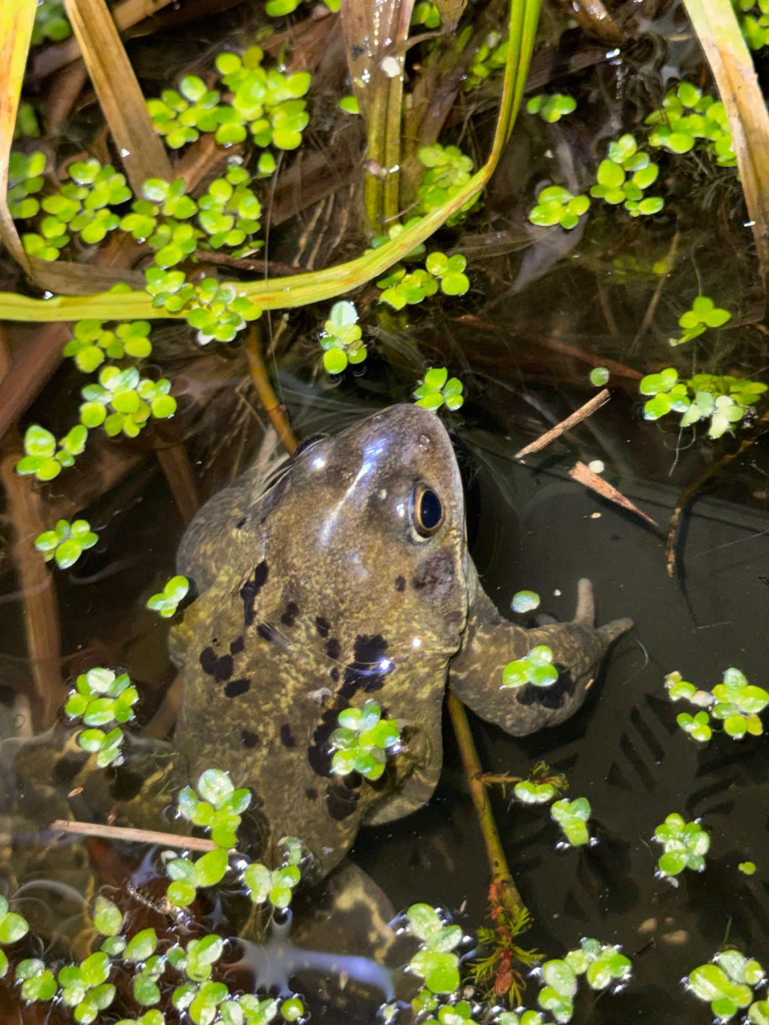 A dark, murky body of water is populated with small, bright green aquatic plants, resembling miniature clovers. Partially submerged within this aquatic environment is a green-brown frog, its head and…read more