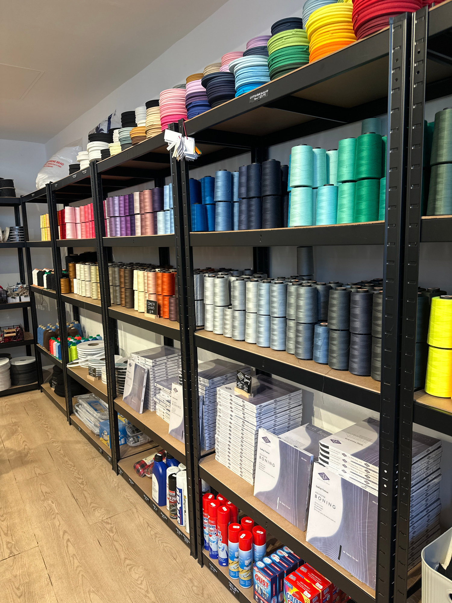 The image shows a retail display shelf, likely in a craft or sewing supply store. The shelves are black metal, and contain various items neatly arranged. The first two shelves are filled with spools o…read more