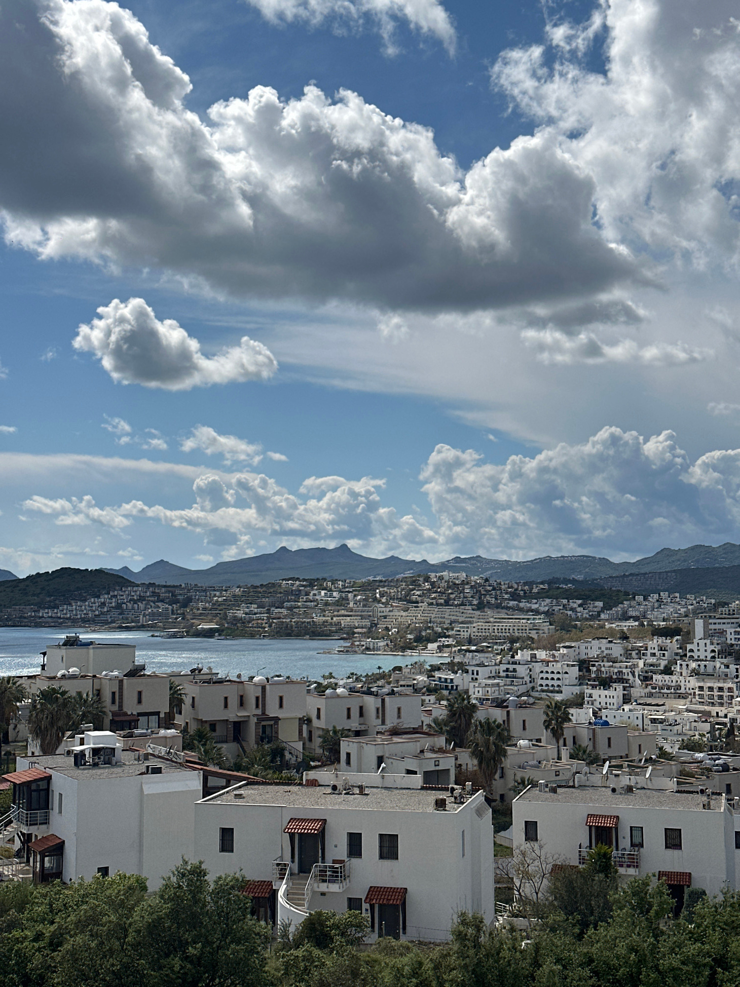 The image is an eye-level aerial view of Bodrum, Turkey, rotated 90 degrees clockwise. The foreground features white buildings with terracotta roofs, interspersed with trees and foliage. In the middle…read more