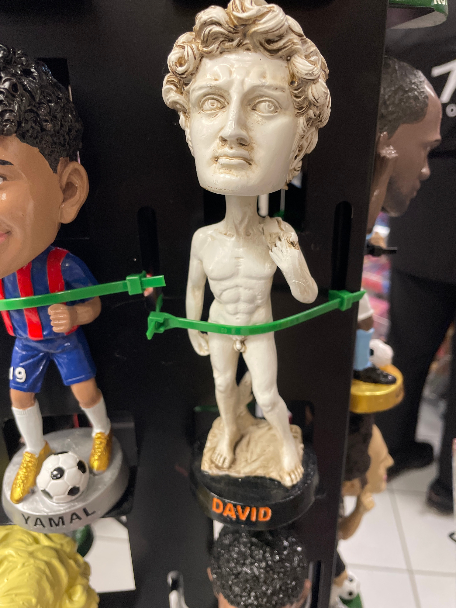 The image depicts a shelf displaying bobblehead figures. The most prominent figure is a white, classical-style sculpture of David, identifiable by the "DAVID" inscription on its black base. A green zi…read more
