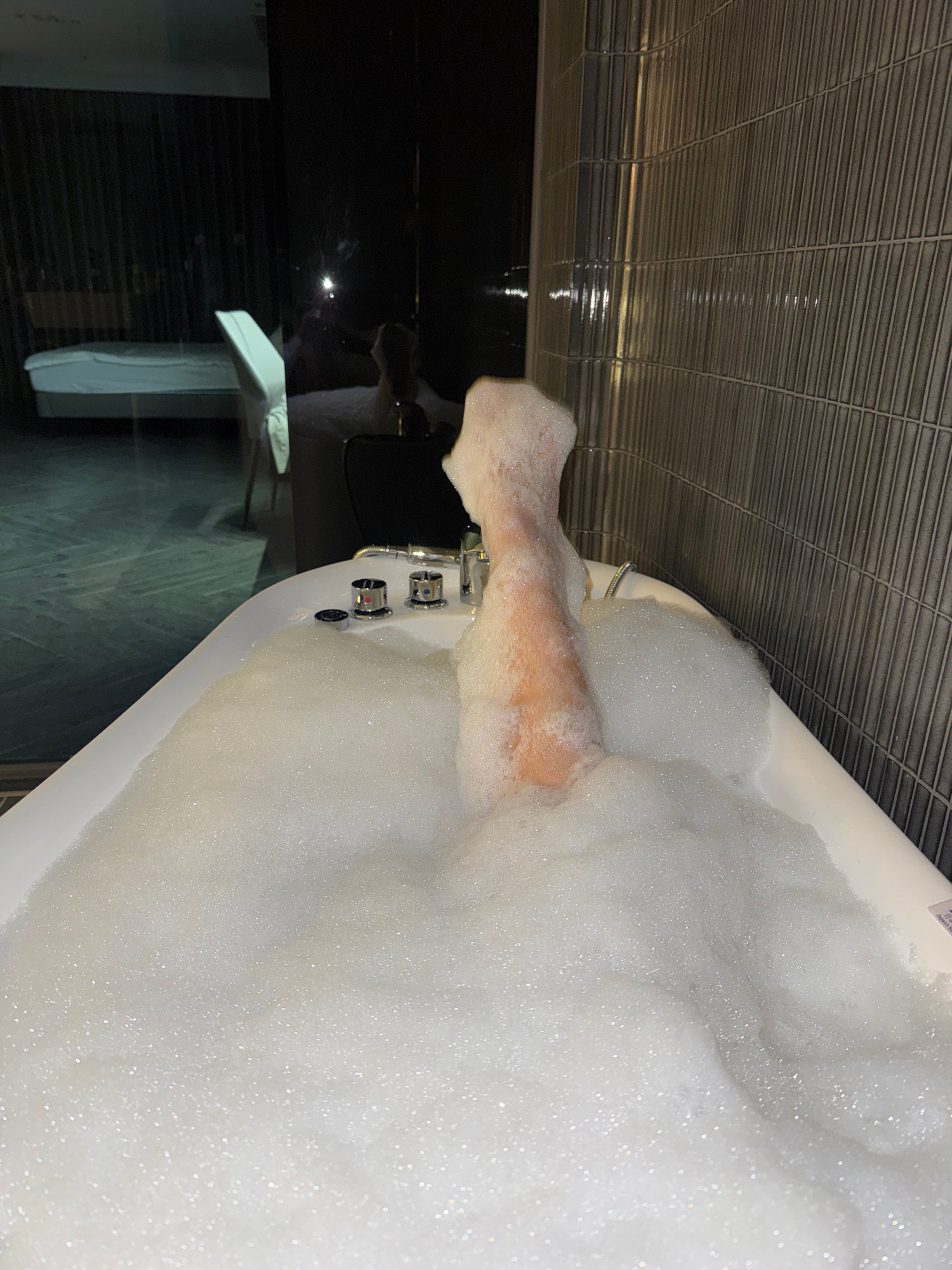 A partial view of a bathtub filled with white bubbles, obscuring most of the interior, is captured at an oblique angle. A human arm emerges from the bubbles, appearing somewhat submerged, with the hanβ¦read more