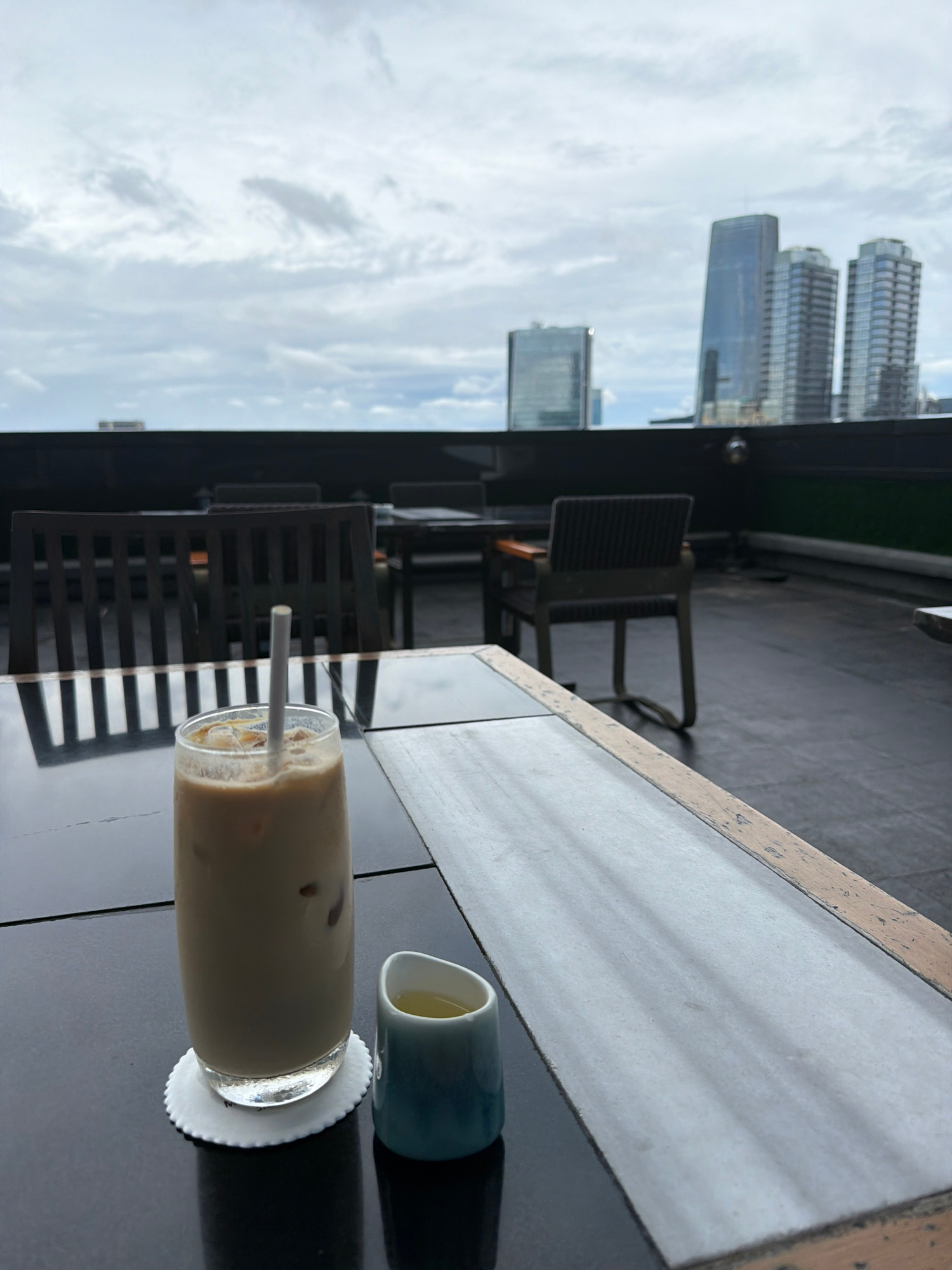 The image shows a rooftop setting, likely in a high-rise building in South Jakarta, Indonesia, as suggested by the distant cityscape visible in the background. The foreground is dominated by a dark-co…read more