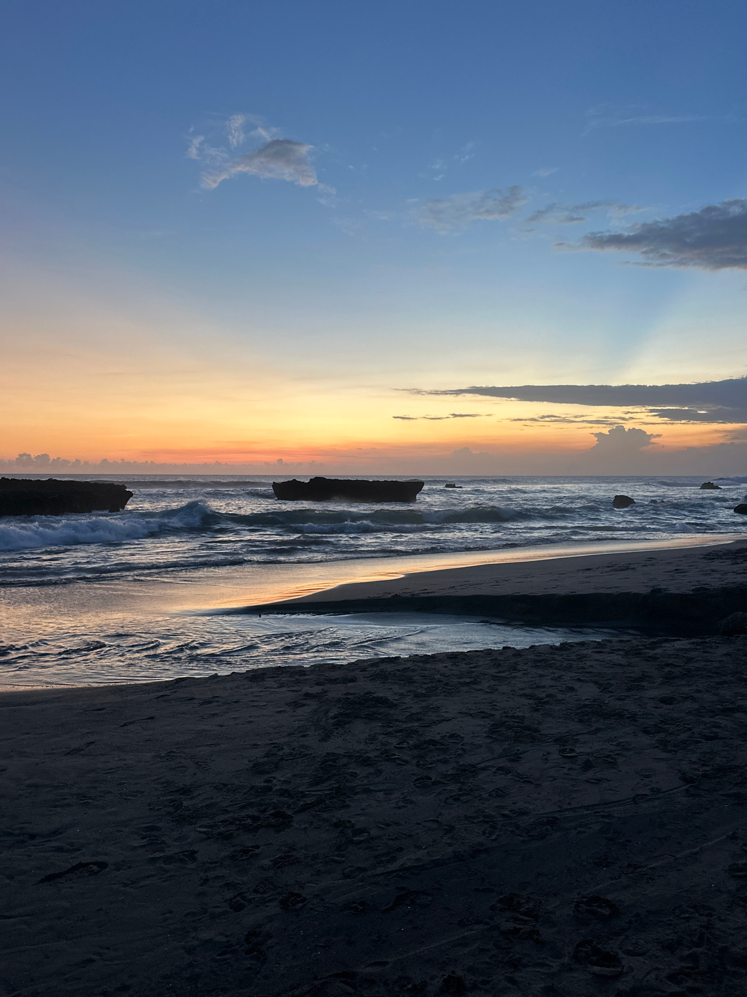 The image depicts a sunset scene at a beach in North Kuta, Indonesia. The sky transitions from blue with scattered clouds to orange and yellow hues near the horizon. The sea is visible with gentle wav…read more