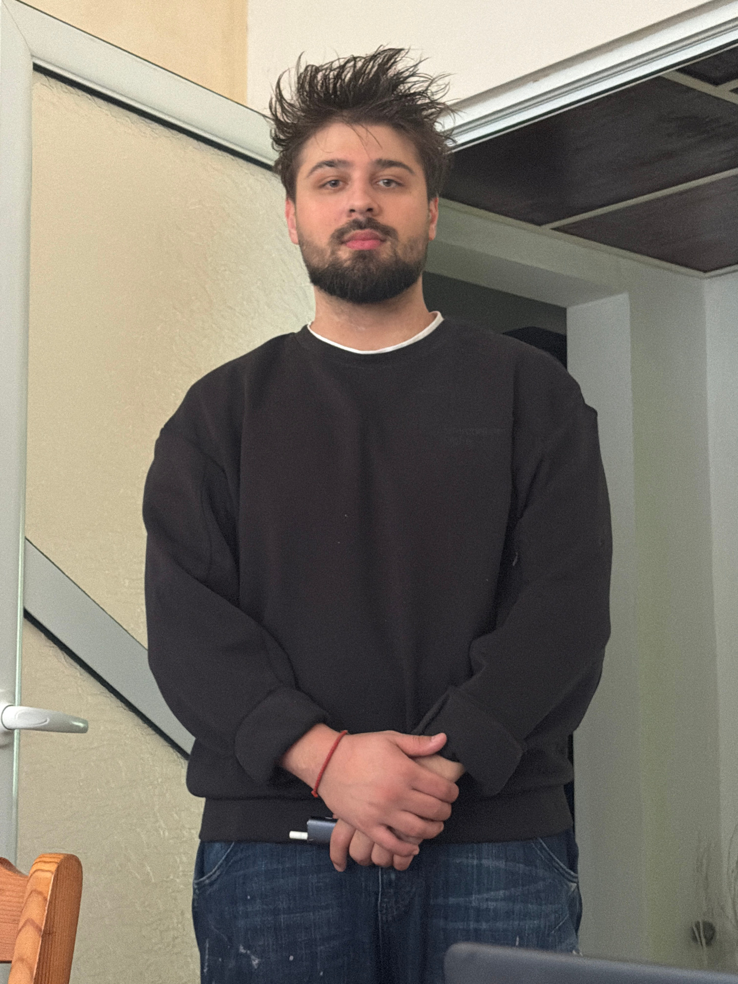 A man with short, dark hair and a beard is standing indoors, wearing a black sweatshirt and blue jeans. He is holding something in his hands, possibly a small device, and his fingers are interlocked.…read more