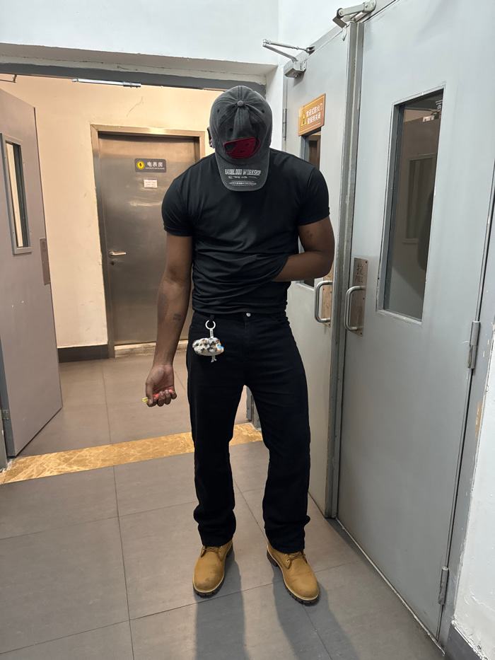 A single individual stands upright in an indoor corridor within Yuzhong District, China. The person, an adult male with a dark complexion, is facing slightly towards the left of the frame. The individ…read more