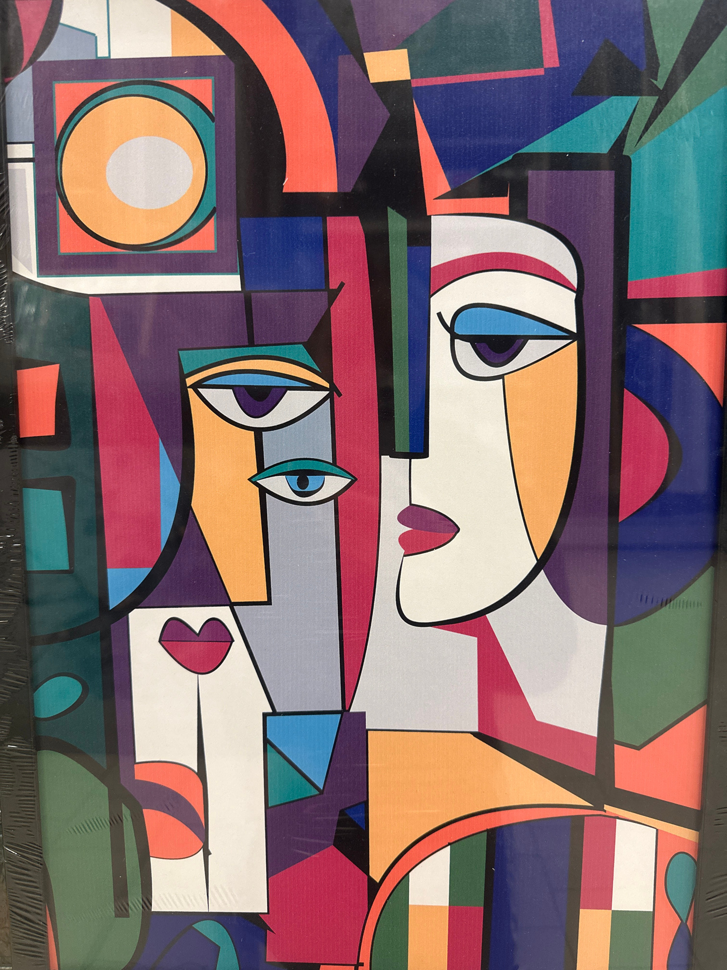 The image is a framed abstract painting featuring two stylized faces composed of geometric shapes and bold colors. The faces are stacked vertically, with the top face slightly larger. The colors inclu…read more