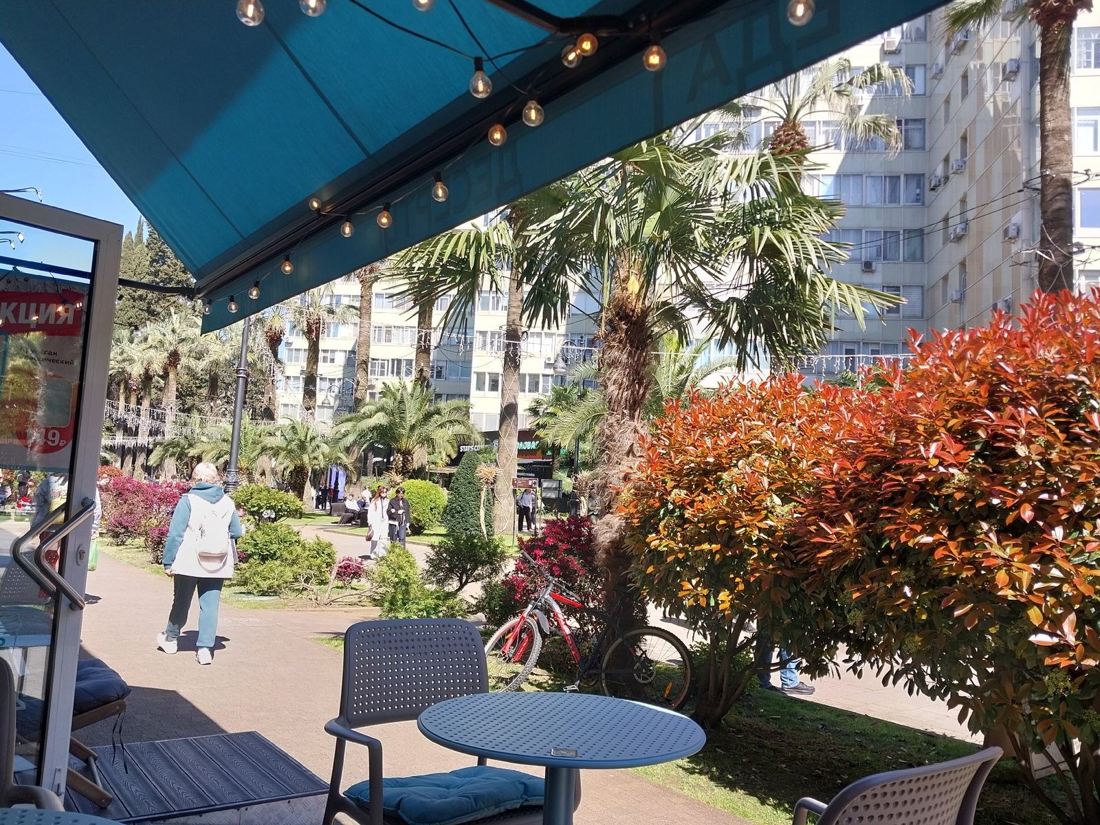 This image captures an inviting outdoor cafe setting on a bright, sunny day, likely in a park or promenade in an urban area like Sochi, Russia. In the immediate foreground, a blue awning, strung with…read more