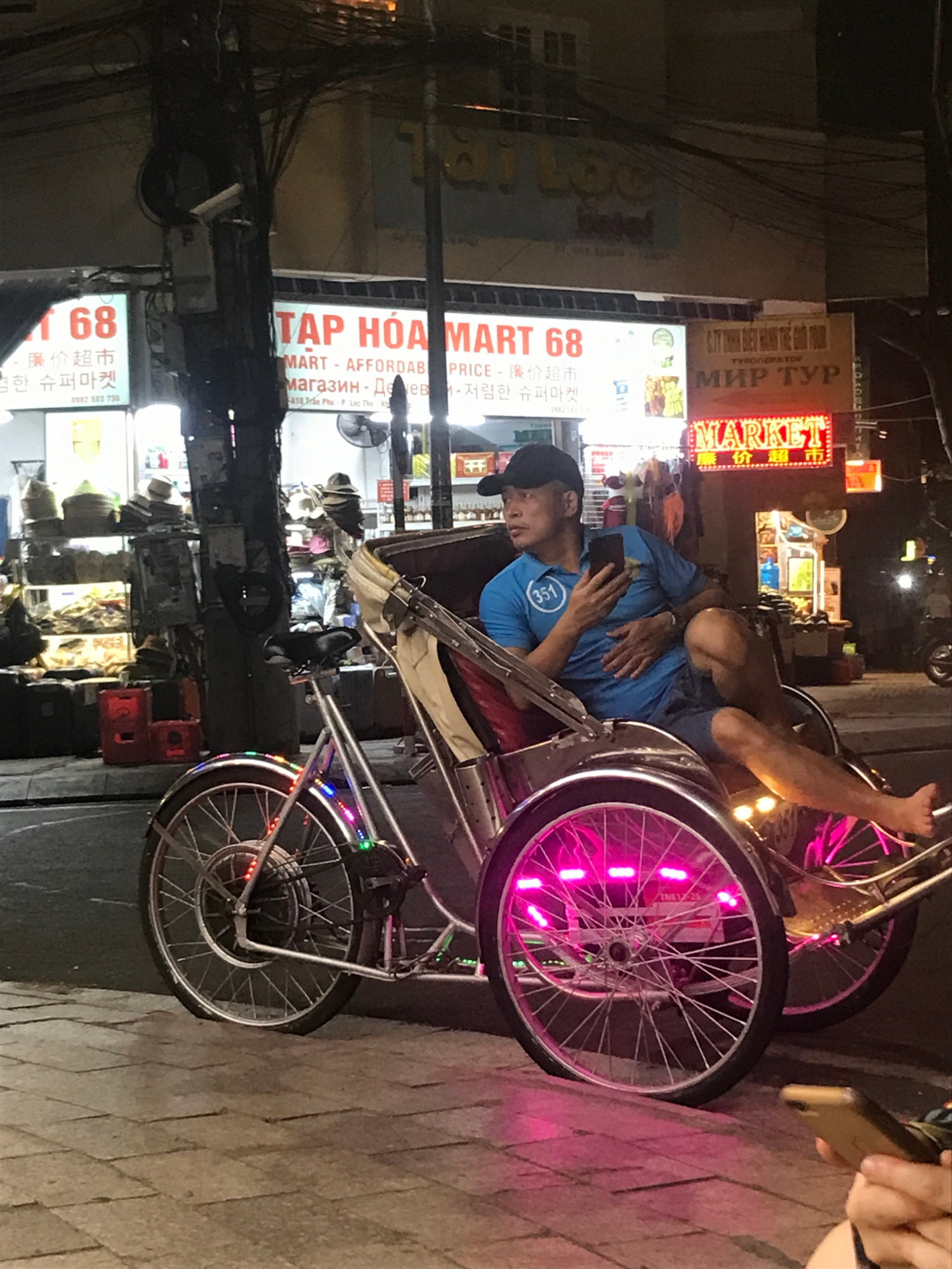 The image shows a man in a blue t-shirt with a black cap sitting in a cyclo (a three-wheeled vehicle used as a taxi) on a street in Nha Trang, Vietnam. The cyclo's wheels have pink and other colored l…read more