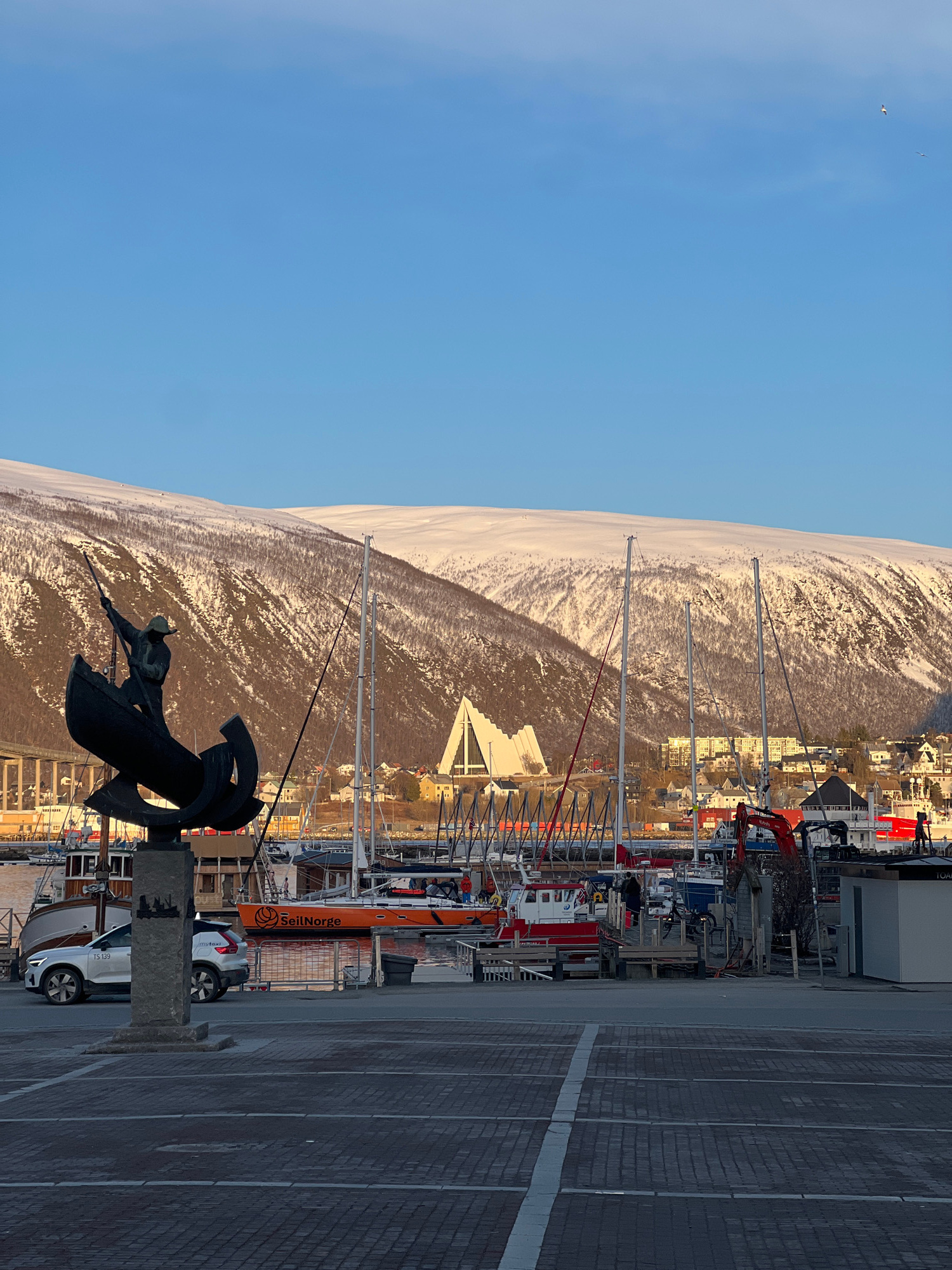This photograph shows a statue of a man with an oar, in the foreground of a harbor in Tromsø, Norway. Behind the statue are boat masts, commercial and residential buildings. In the background is a sno…read more