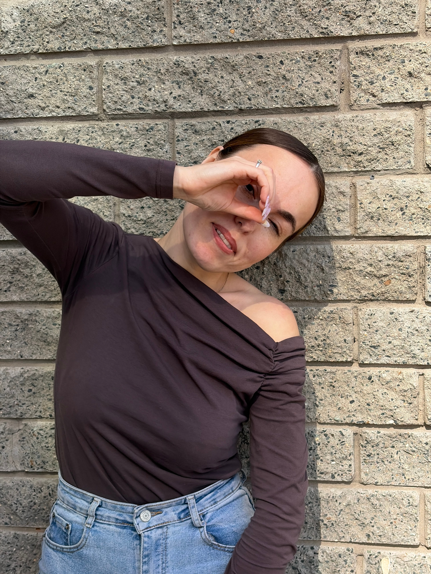 A woman with light skin and dark hair is laying on a light-colored concrete brick surface. She is wearing a dark brown long-sleeved shirt and blue denim jeans. Her left hand is raised to her left eye,…read more