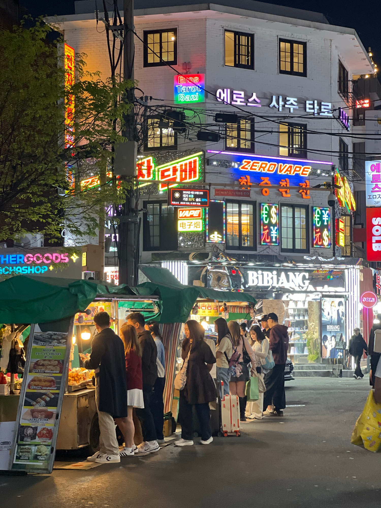 This image shows a nighttime street scene in Seoul, South Korea. People stand in line at food stalls, with several displaying menus featuring various Korean street foods. Buildings in the background a…read more
