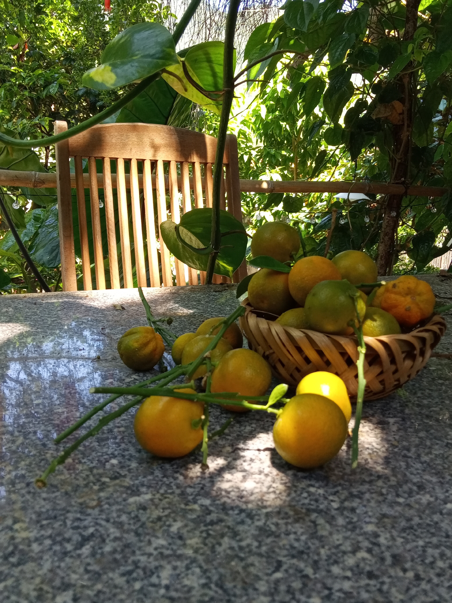 An outdoor setting in Nha Trang, Vietnam, features a grey, speckled granite tabletop positioned centrally in the foreground. Resting on the tabletop are numerous small, round citrus fruits, exhibiting…read more