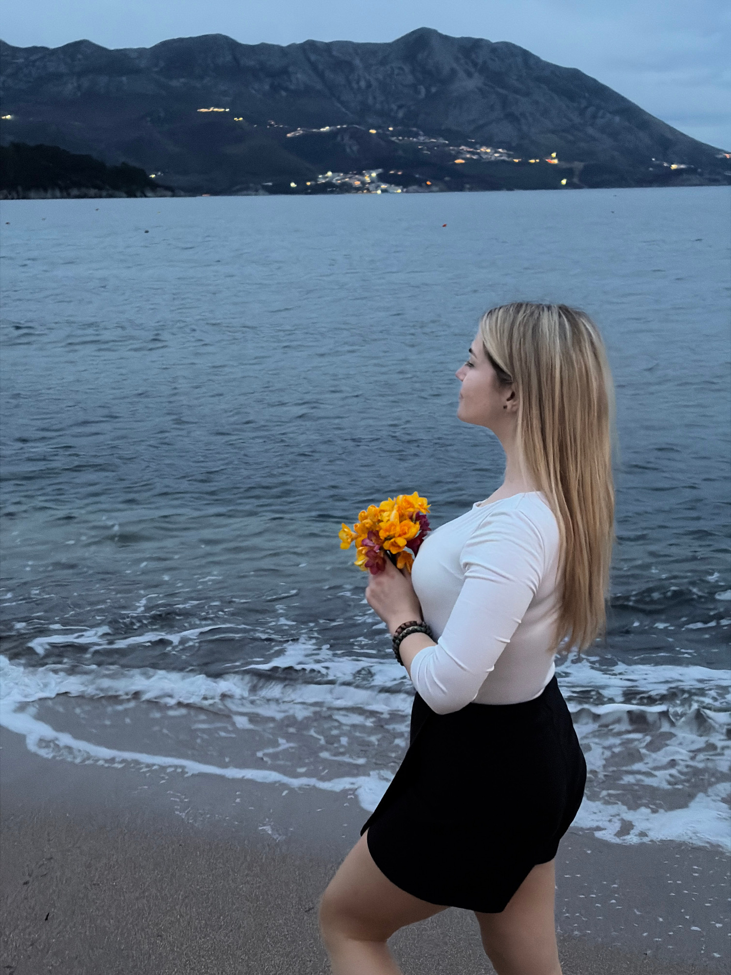 A young woman with blonde hair stands on a sandy beach, holding a bouquet of yellow and maroon flowers. She wears a white long-sleeved shirt and a black skirt. The sea's waves are washing onto the sho…read more