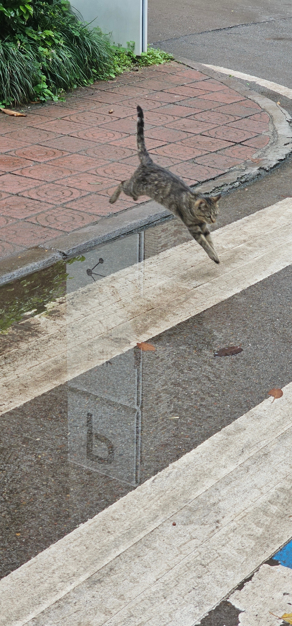 A photograph from Yuzhong District, China, taken from an elevated position, shows an alleyway. A tabby cat is in mid-leap from a brick paved surface towards a crosswalk marked with alternating white a…read more