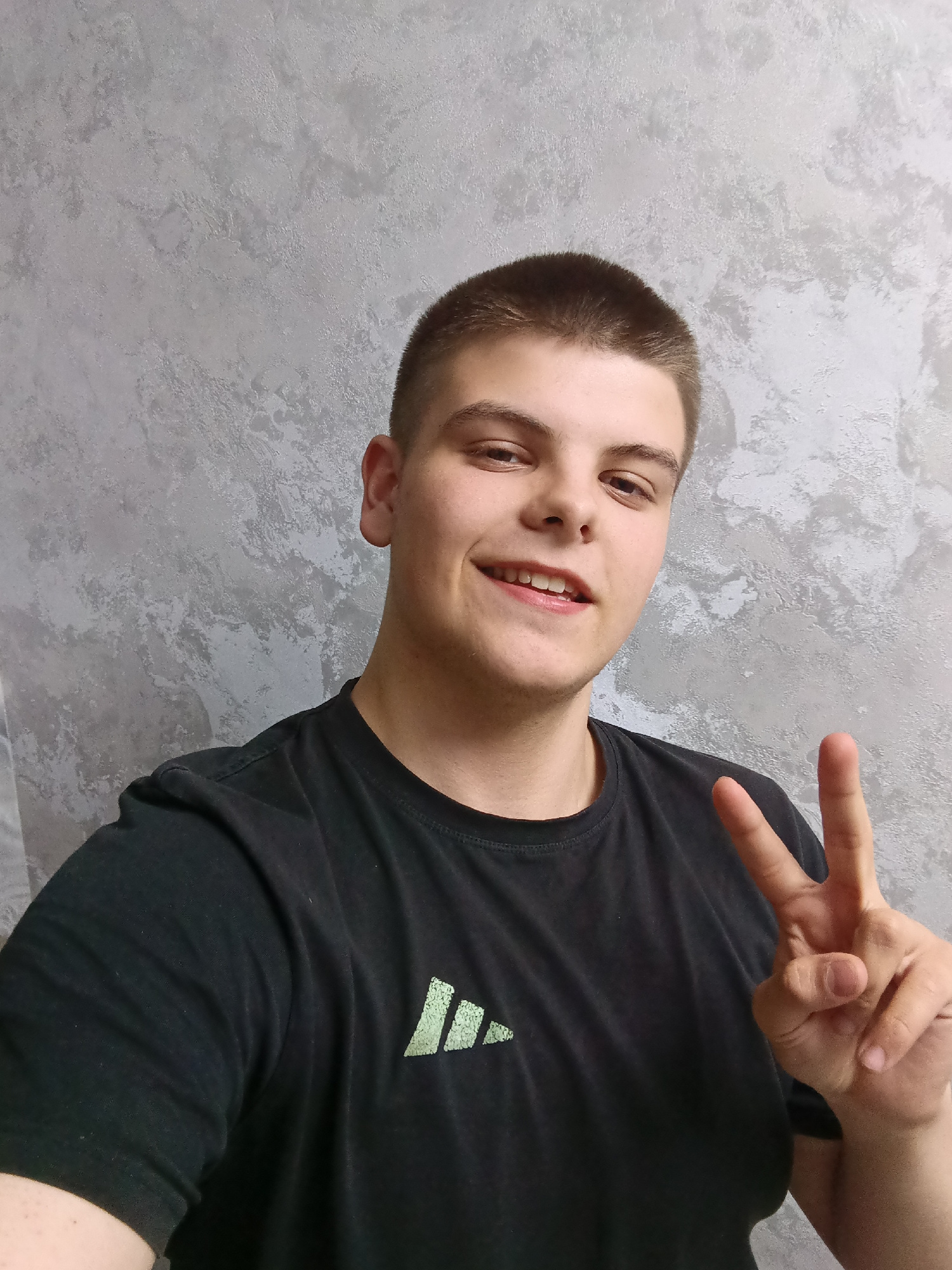 A young man with short brown hair and a black t-shirt with a green logo is posing in front of a grey mottled wall. He is making a peace sign with his right hand and smiling slightly. The location is i…read more