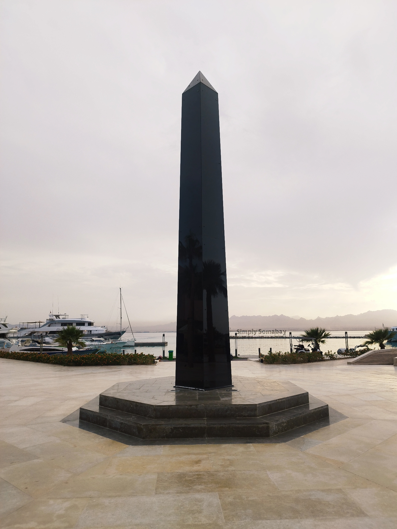 The image shows a tall, black, obelisk-like monument in Ras Abu Soma, Egypt. The structure has a square base that tapers to a point at the top. It appears to be made of polished stone or metal. The mo…read more
