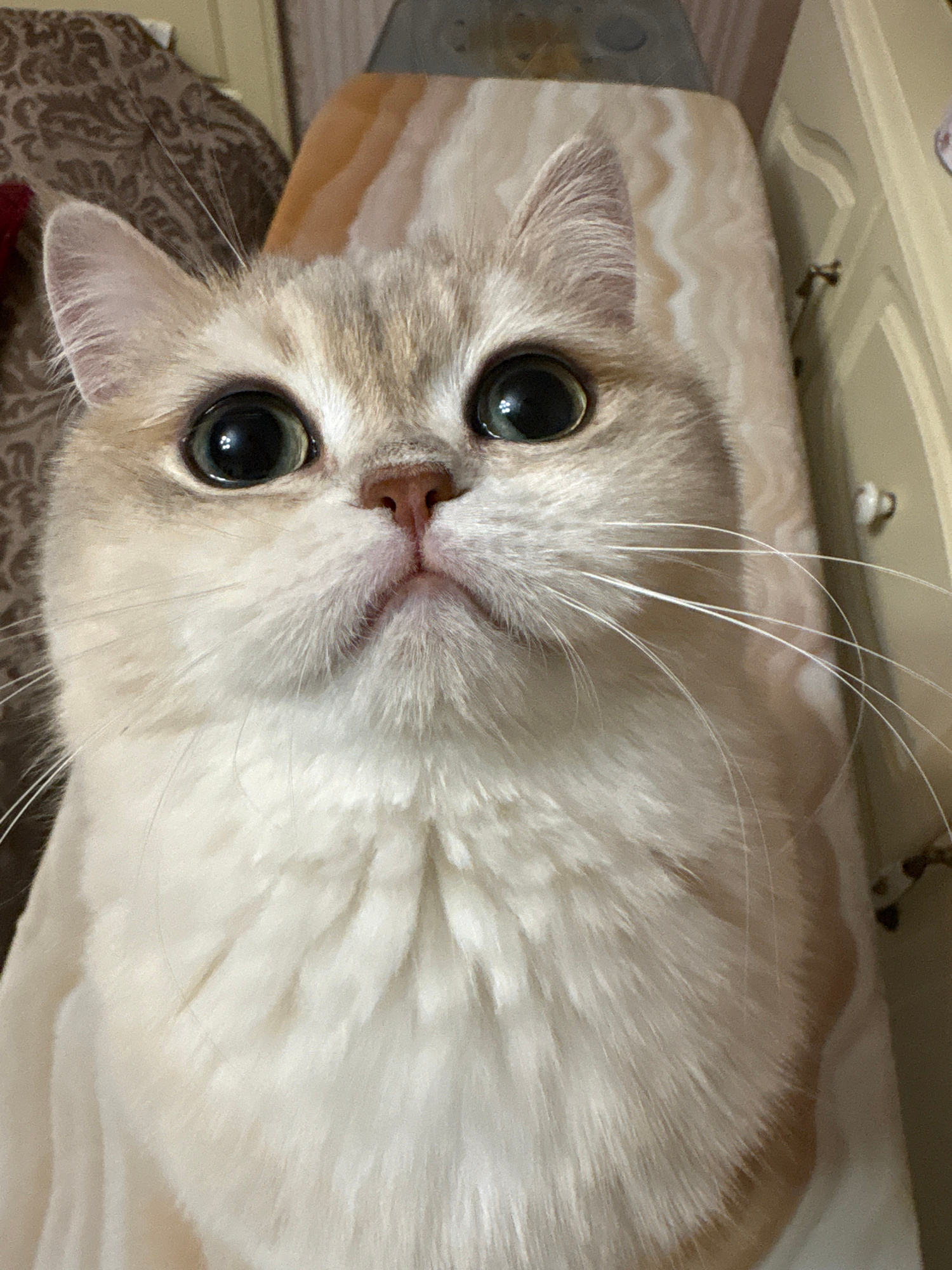A close-up, angled shot features a cat's face, emphasizing its large, dark eyes, pink nose, and white fur. Long whiskers extend from the muzzle. The cat is resting on what appears to be a patterned su…read more