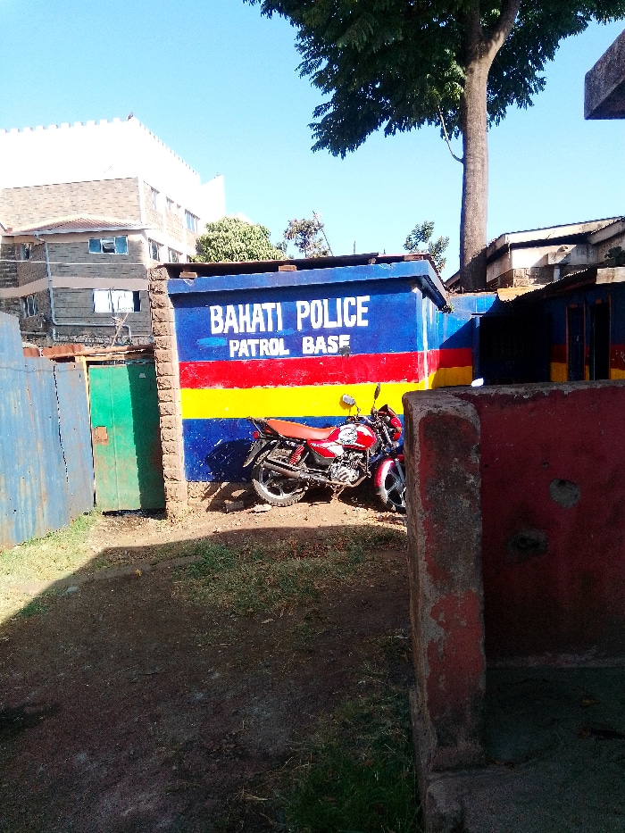 The image captures an outdoor daytime scene at the Bahati Police Patrol Base located in Bahati, Nairobi, Kenya. The central subject is a small, single-story building identified by "BAHATI POLICE PATRO…read more