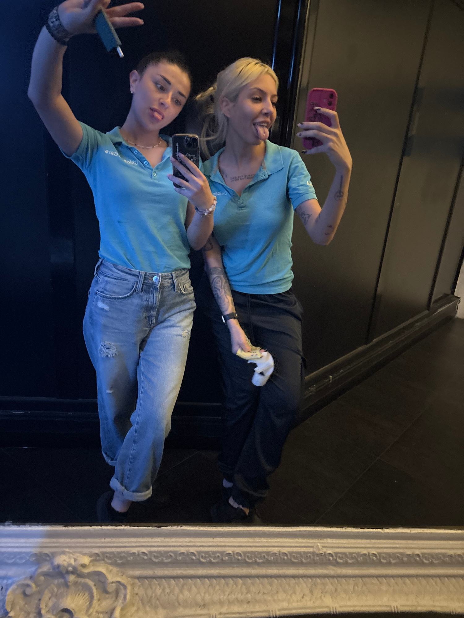 Two young women are reflected in a mirror. The woman on the left is holding a phone and appears to be taking a selfie. She is wearing a blue polo shirt and light-wash jeans. She has short dark hair an…read more
