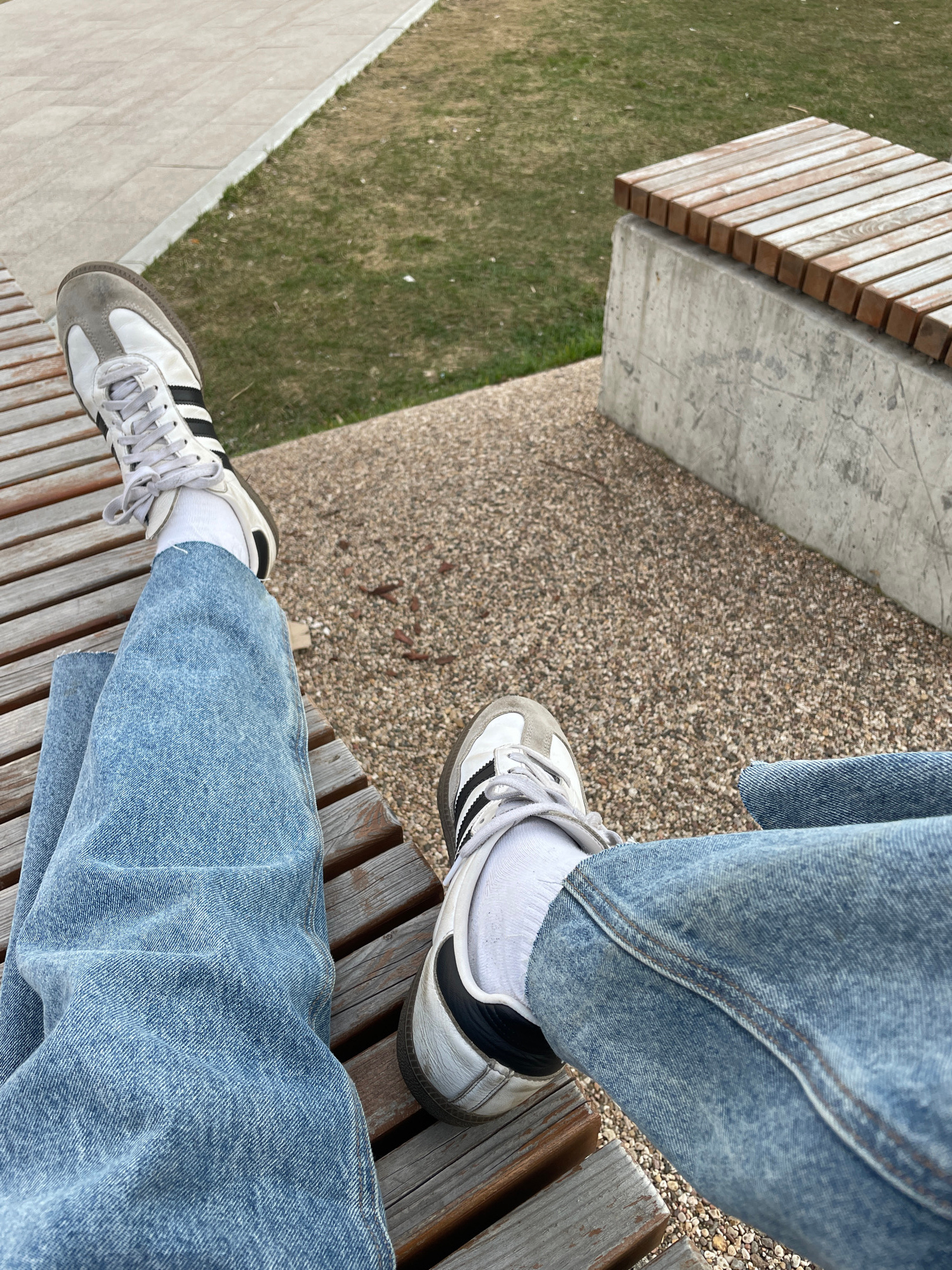 The image shows a first-person view of someone sitting on a wooden bench in an outdoor setting. The person is wearing light blue jeans and white Adidas Samba sneakers with white socks. The bench has a…read more