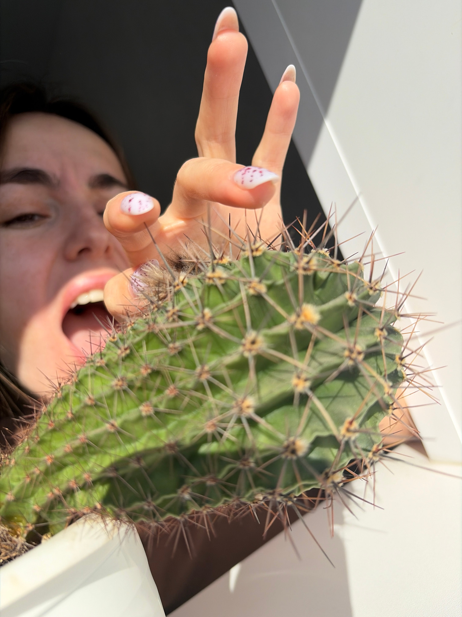 A low-angle, somewhat obscured view features a woman's face and hand near a cactus. The woman has brown hair and is looking upward with her mouth open. Her hand, with white nails decorated with small…read more