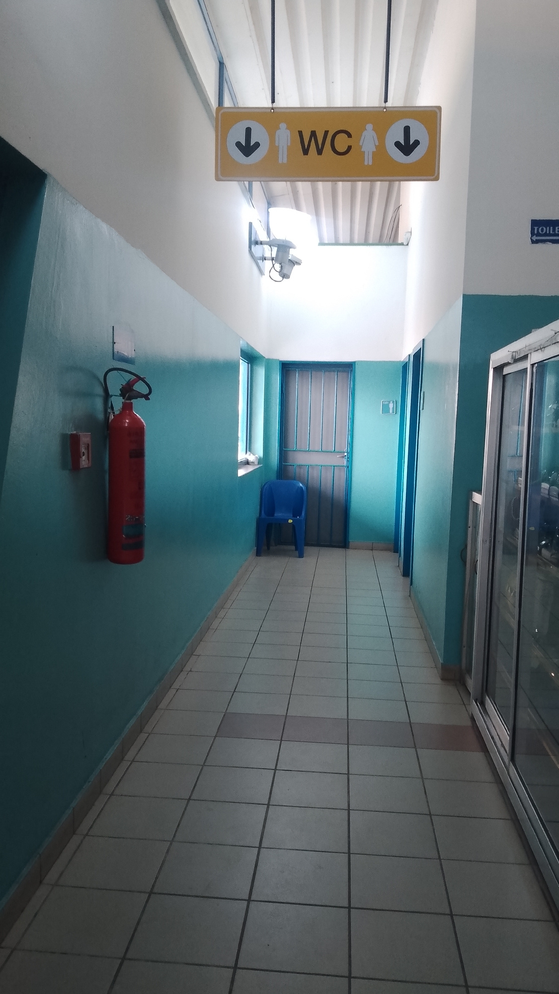 A hallway in Orerokpe, Nigeria, features a red fire extinguisher mounted on a turquoise wall on the left. The floor is tiled in a light-colored grid pattern. A blue plastic chair sits against the wall…read more