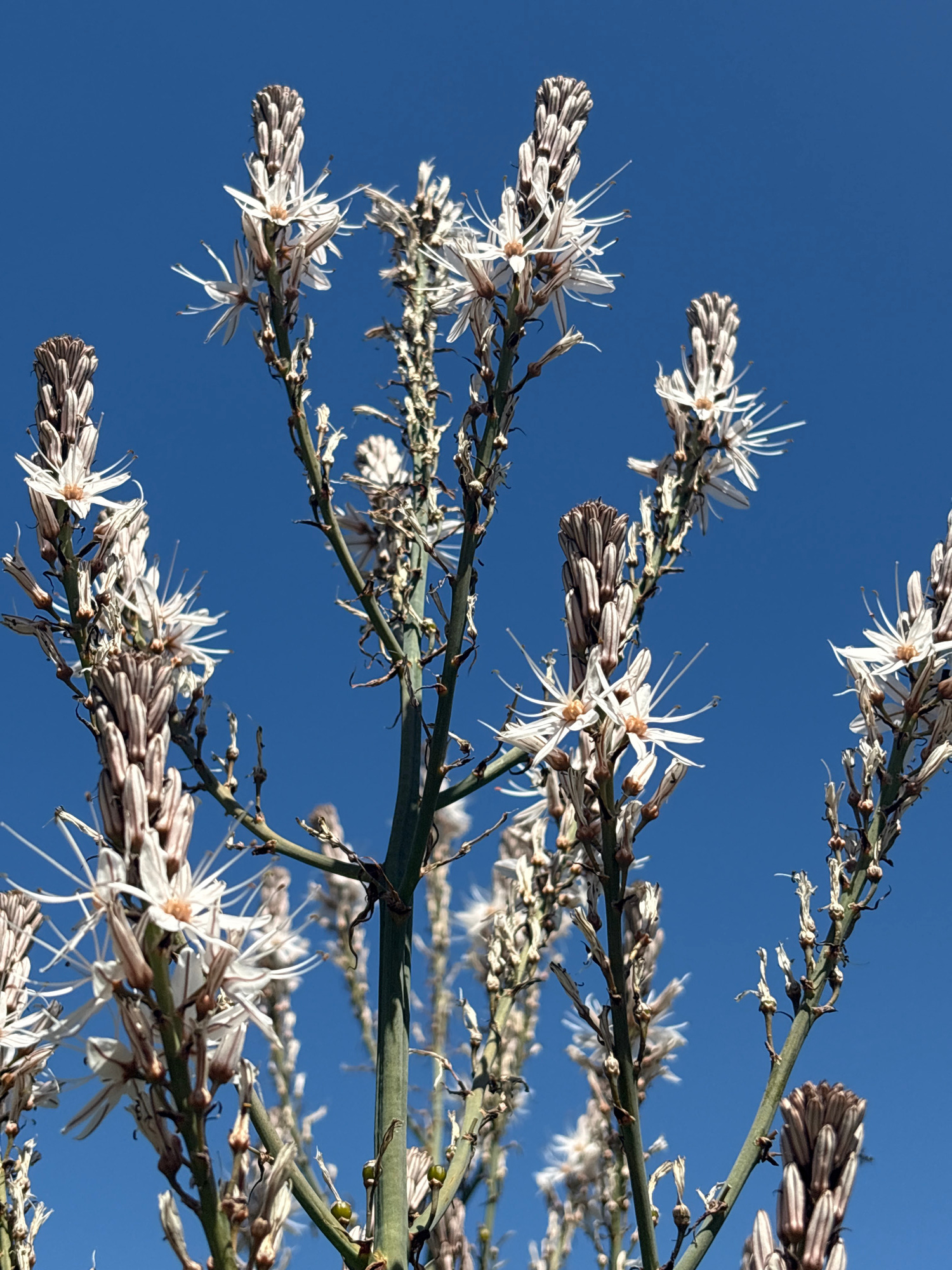 The image shows a plant with thin, green stems and numerous white flowers against a clear, bright blue sky. The flowers are star-shaped with spiky petals. They grow in clusters along the stems, with s…read more