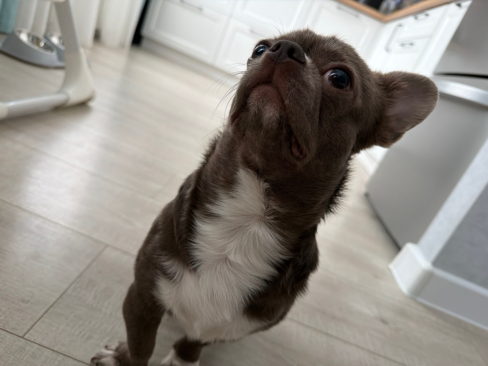 A close-up, tilted photograph shows a small brown and white dog in an indoor setting. The dog is positioned upside down in the frame. The environment appears to be a kitchen or similar space with ligh…read more
